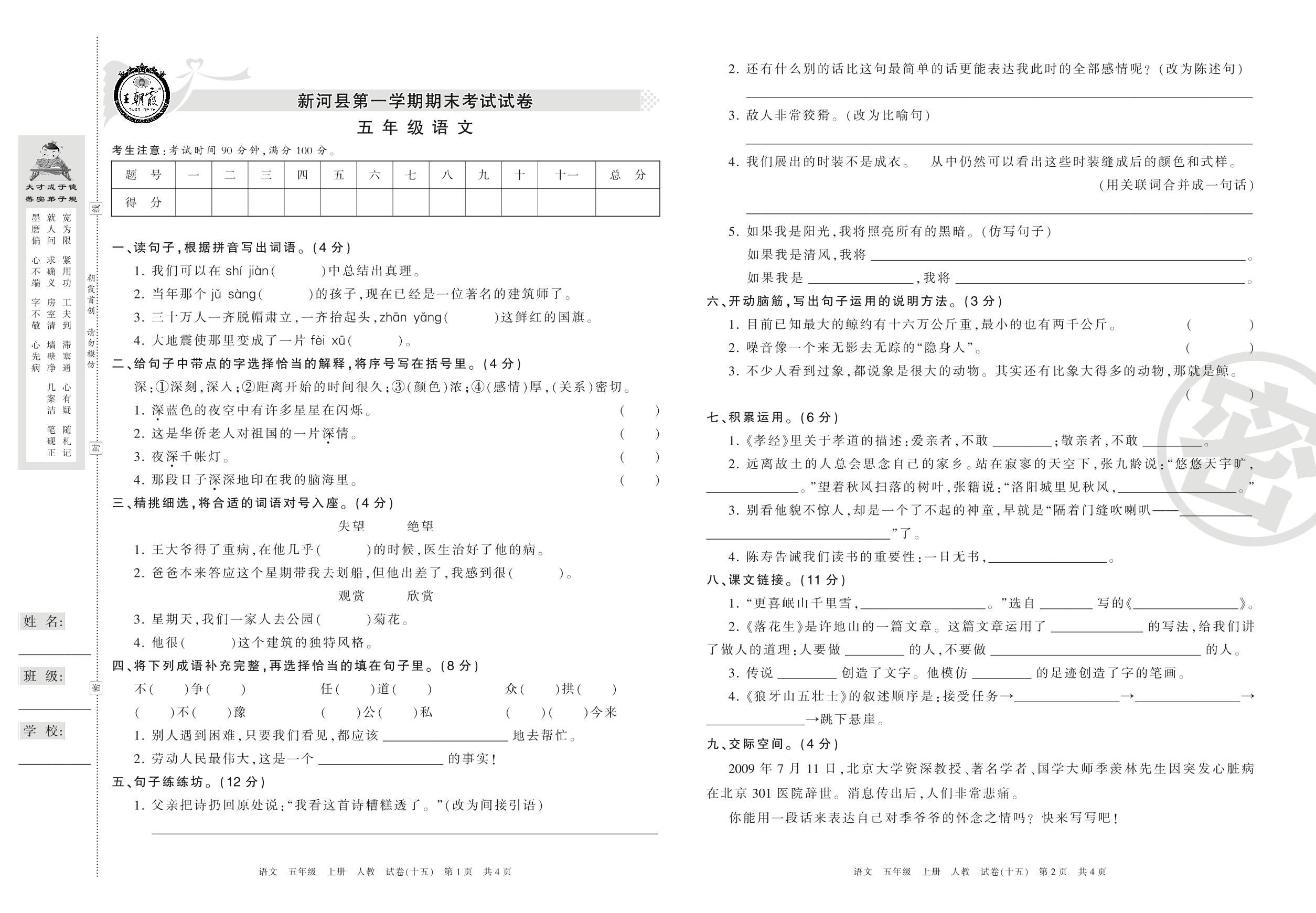 2016-2017学年第一学期邢台市新河县五年级语文试卷(人教版)【15】