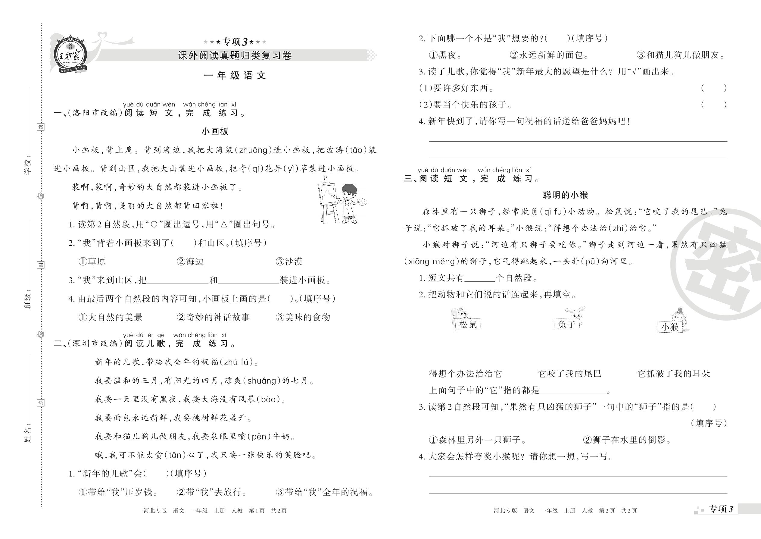 王朝霞期末专项卷——课外阅读真题归类复习卷一年级上册语文(人教版)_R211224092943489【3】