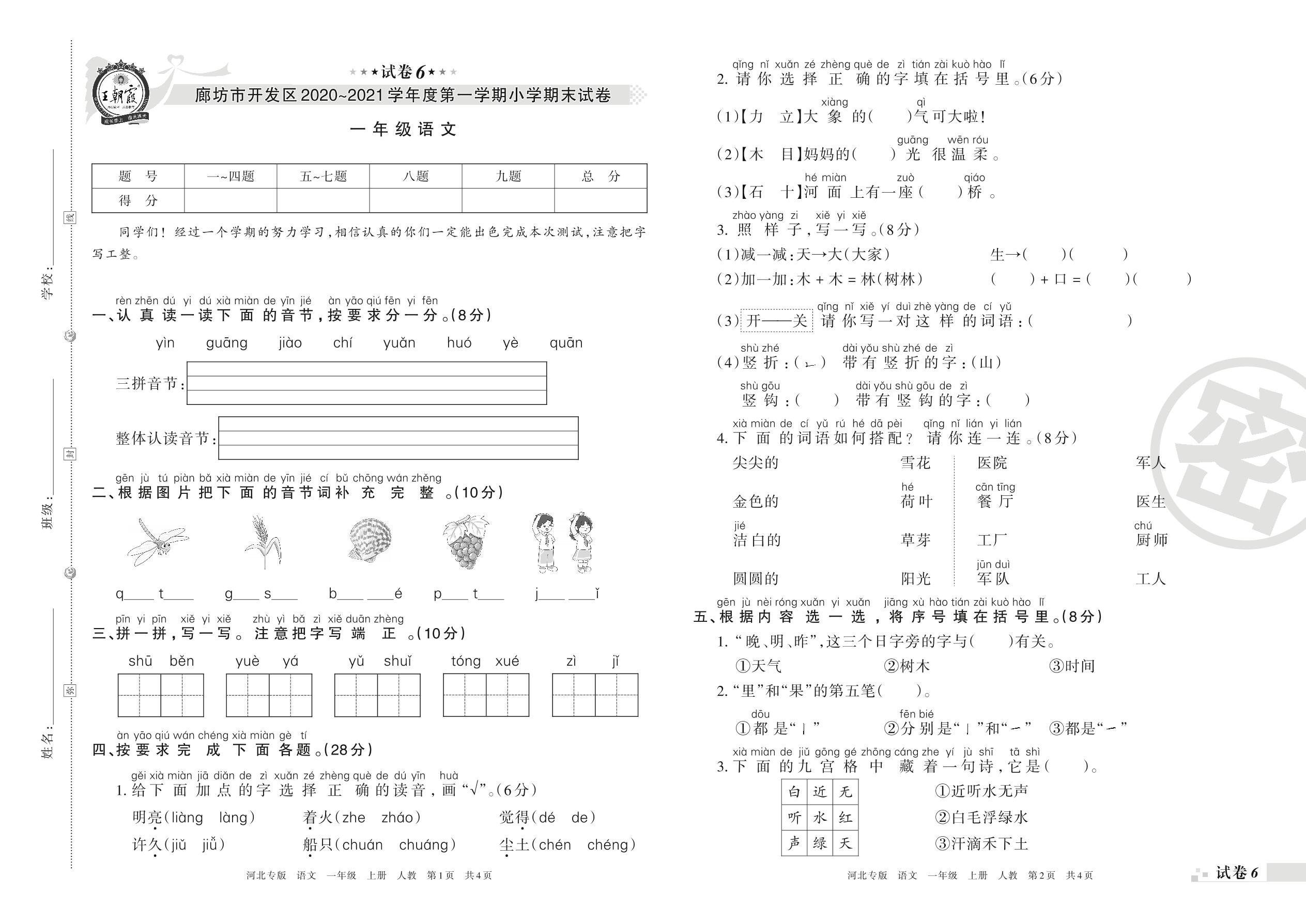 廊坊市开发区2020~2021学年度第一学期小学期末试卷一年级语文(人教版)【6】