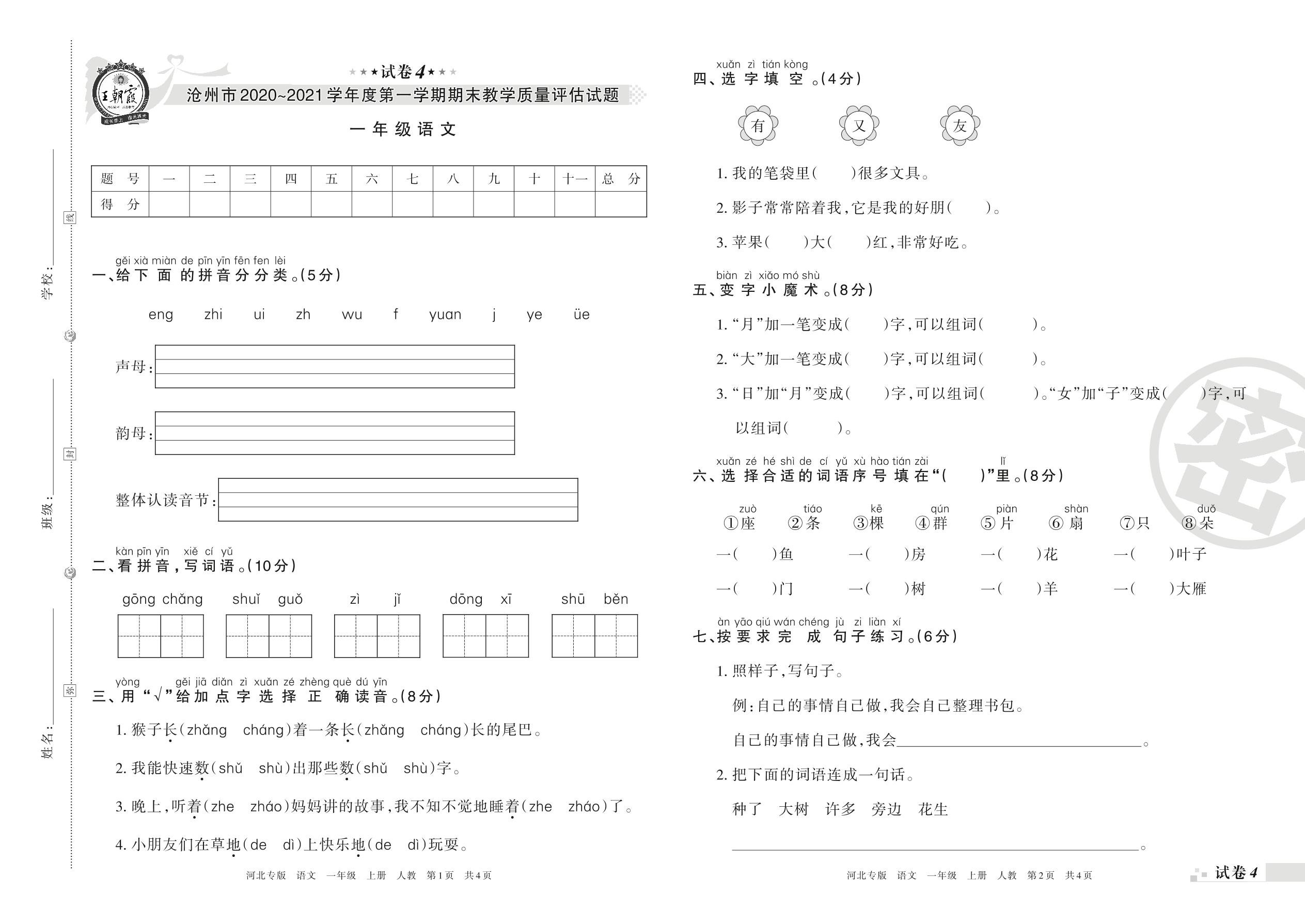 沧州市2020~2021学年度第一学期期末教学质量评估试题一年级语文(人教版)【4】