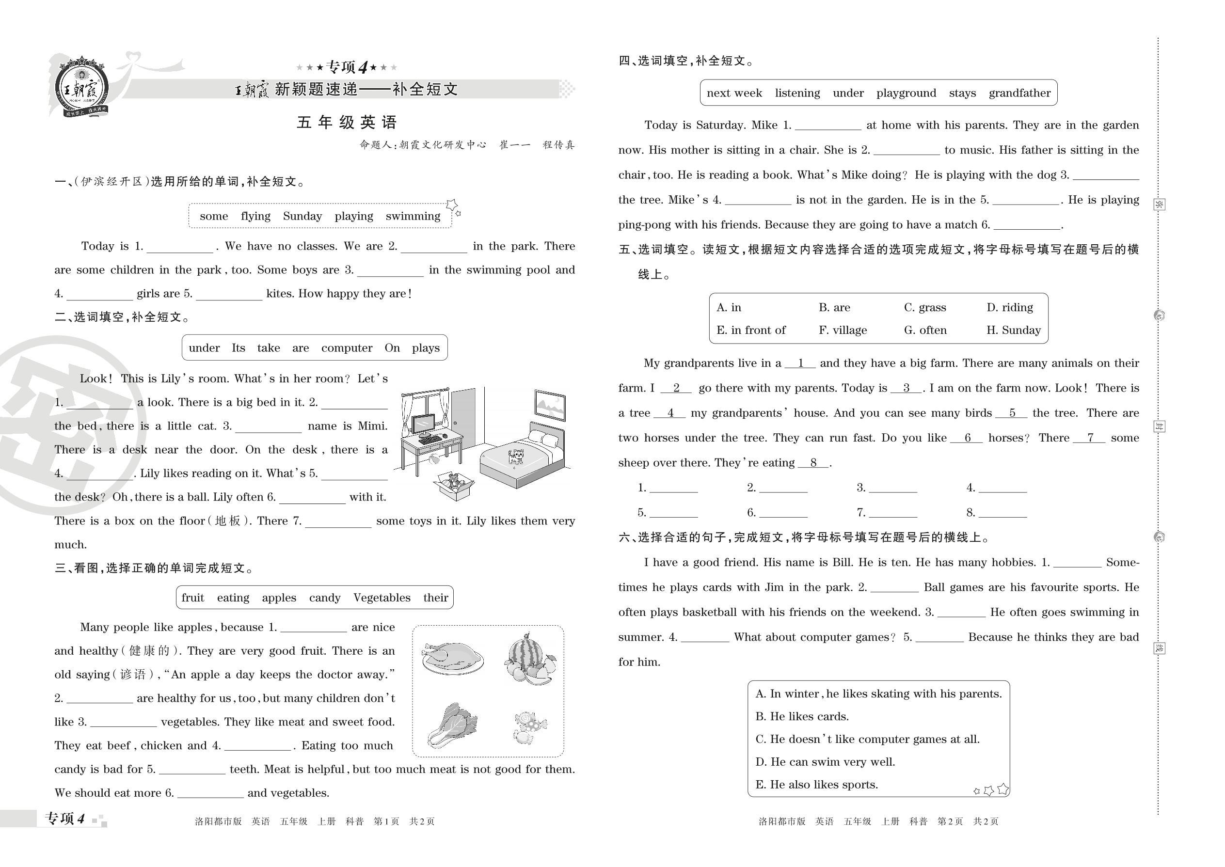 王朝霞期末专项卷——新颖题速递:补全短文五年级上册英语(科普版)【4】
