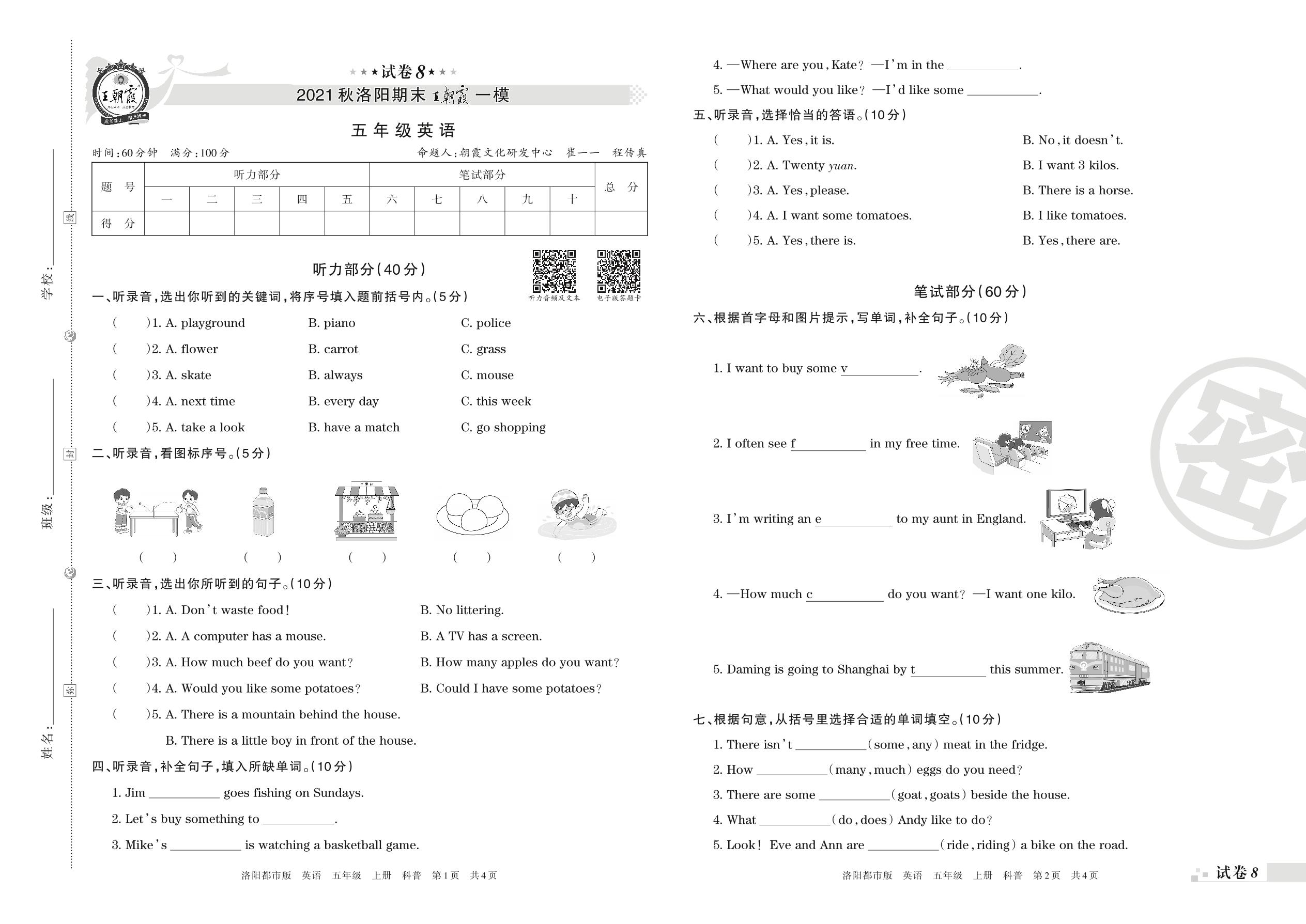 王朝霞期末模拟卷五年级上册英语(科普版)_R211224093145168【8】