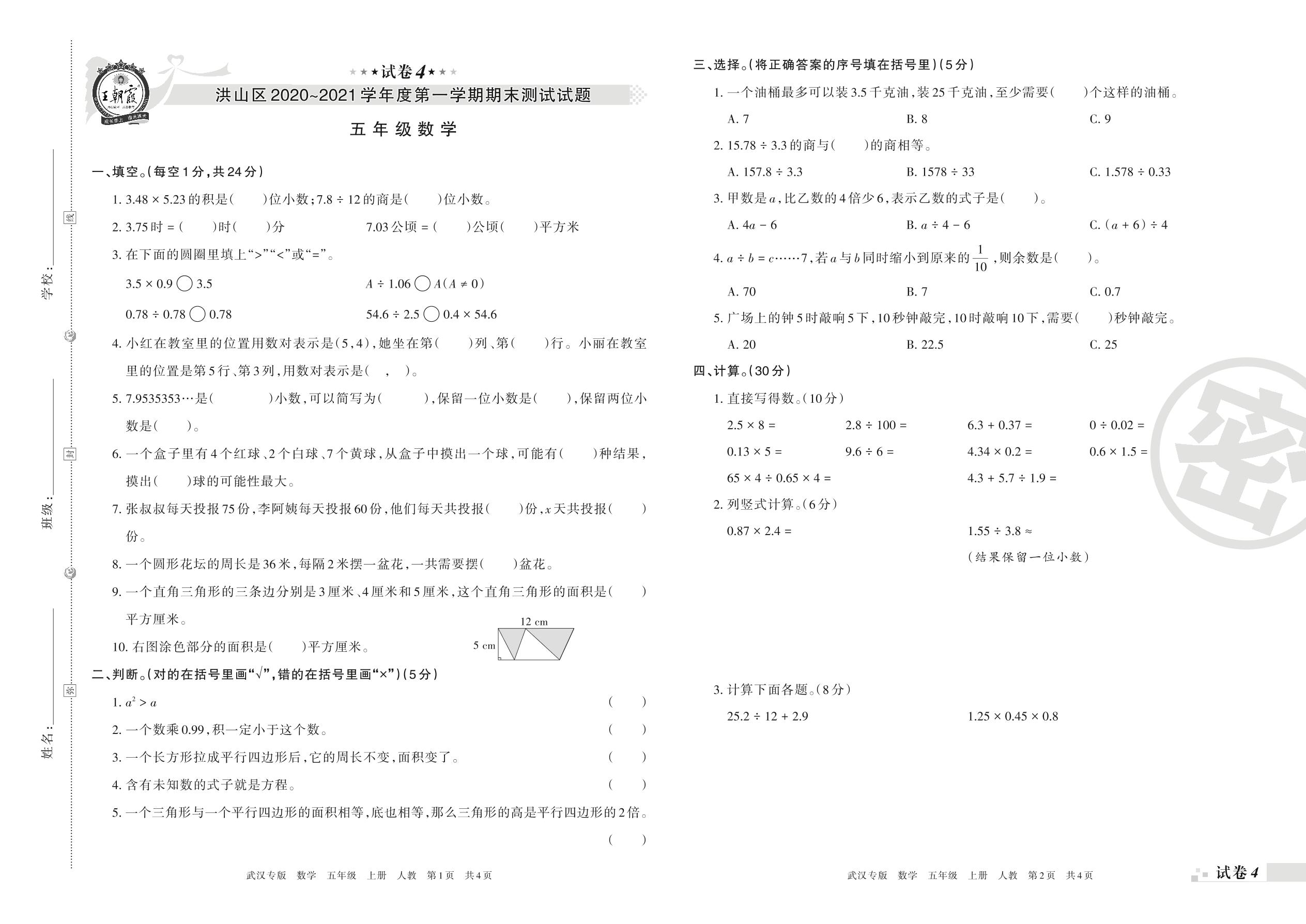 洪山区2020~2021学年度第一学期期末测试试题五年级数学(人教版)【4】