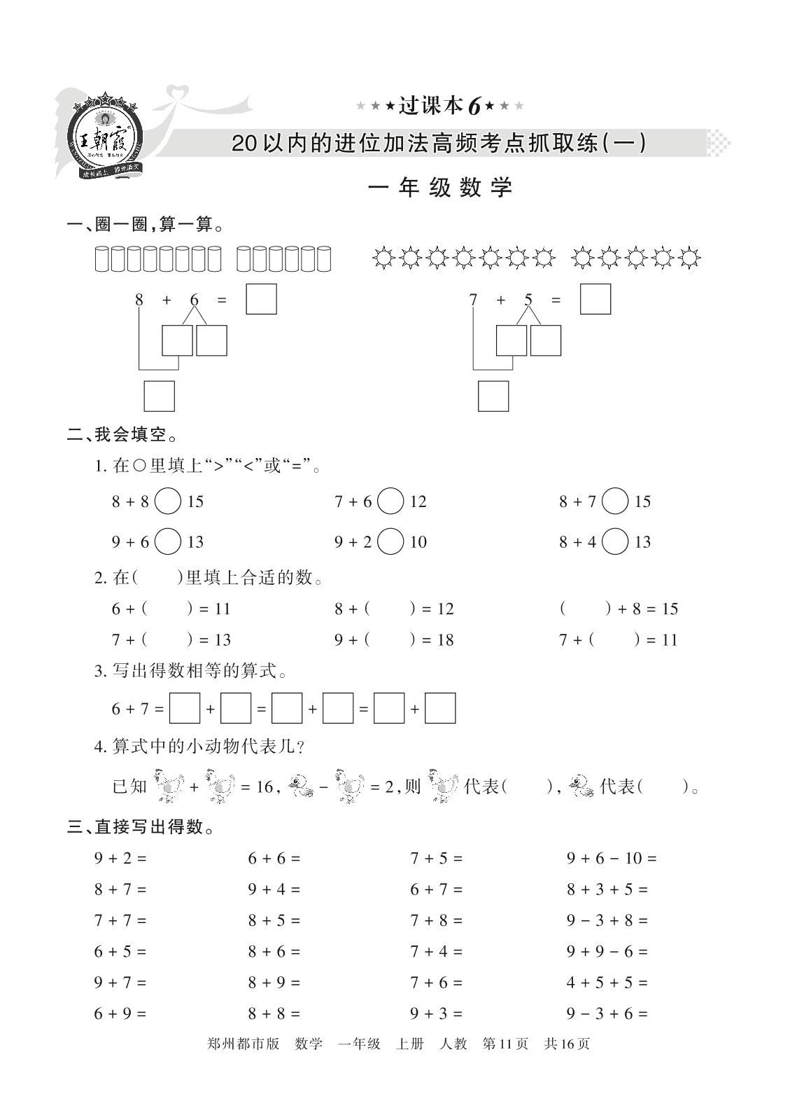 王朝霞期末过课本——20以内的进位加法高频考点抓取练(一)一年级上册数学(人教版)_R211224093606522【6】