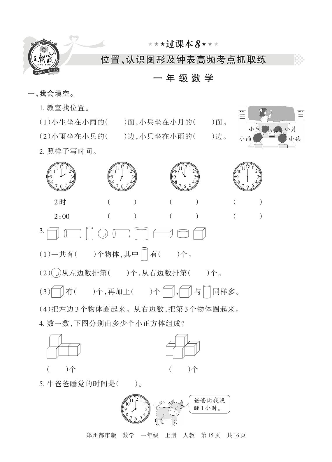 王朝霞期末过课本——位置、认识图形及钟表高频考点抓取练一年级上册数学(人教版)_R211224093606683【8】