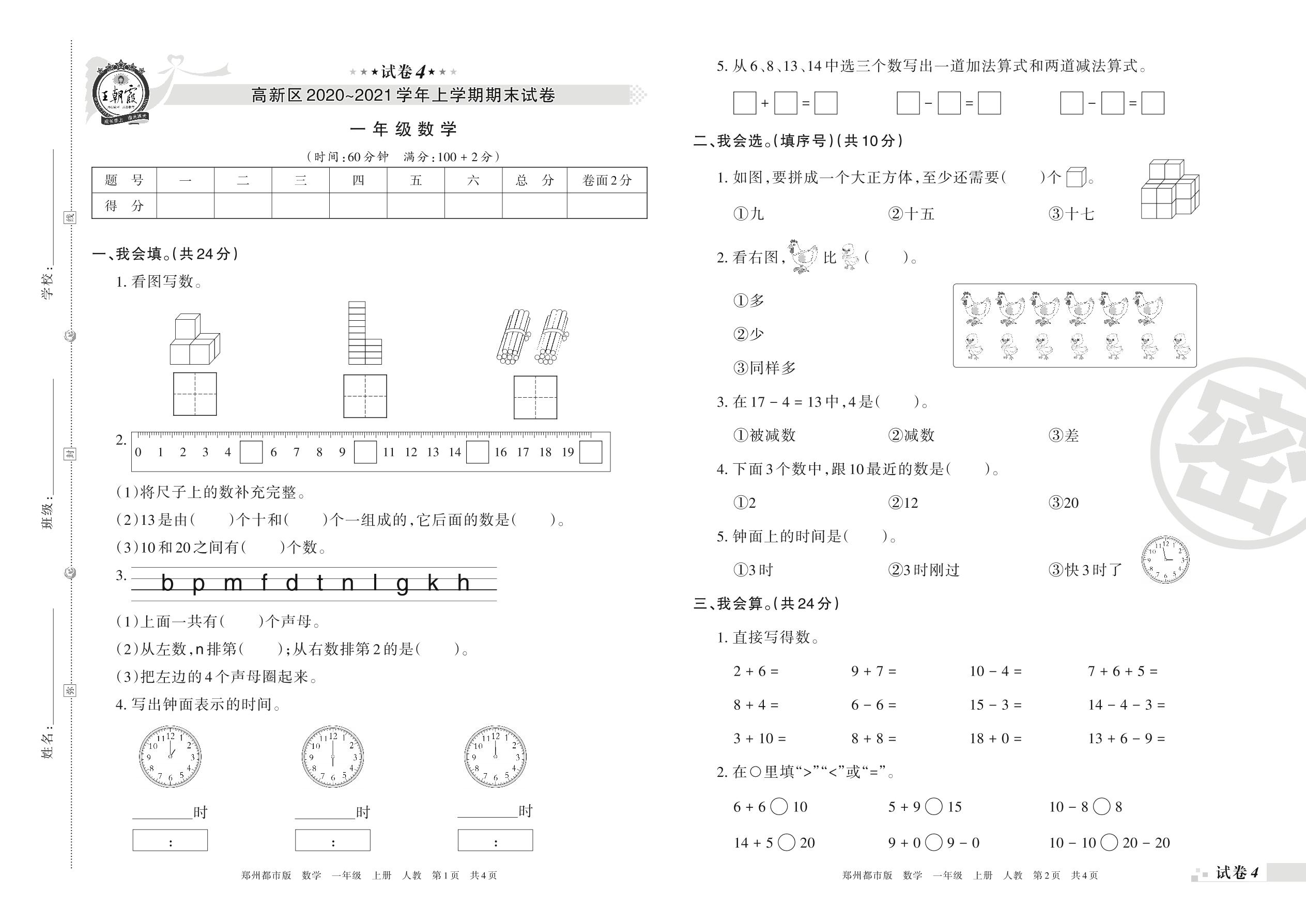 高新区2020~2021 学年上学期期末试卷一年级数学(人教版)【4】