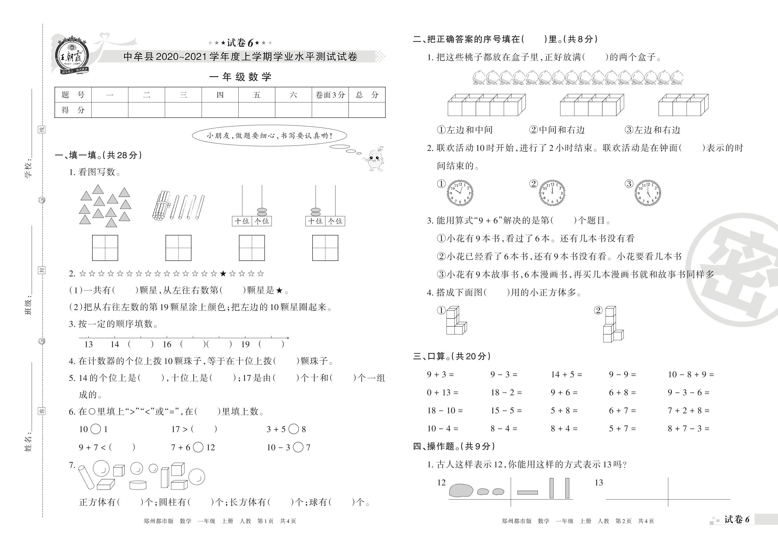 中牟县2020~2021 学年度上学期学业水平测试试卷一年级数学(人教版)【6】