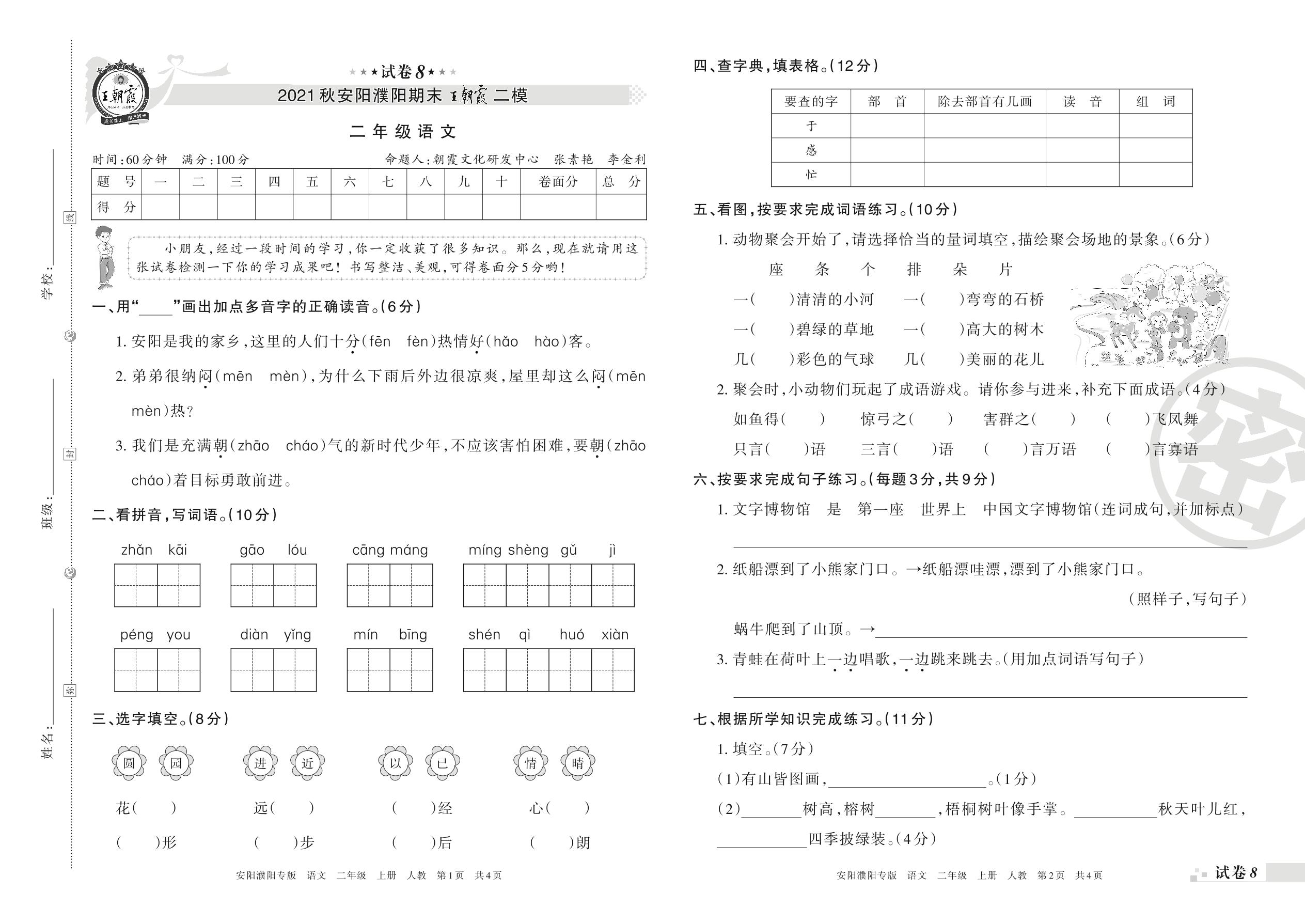 王朝霞期末模拟卷二年级上册语文(人教版)_R211224093608883【8】