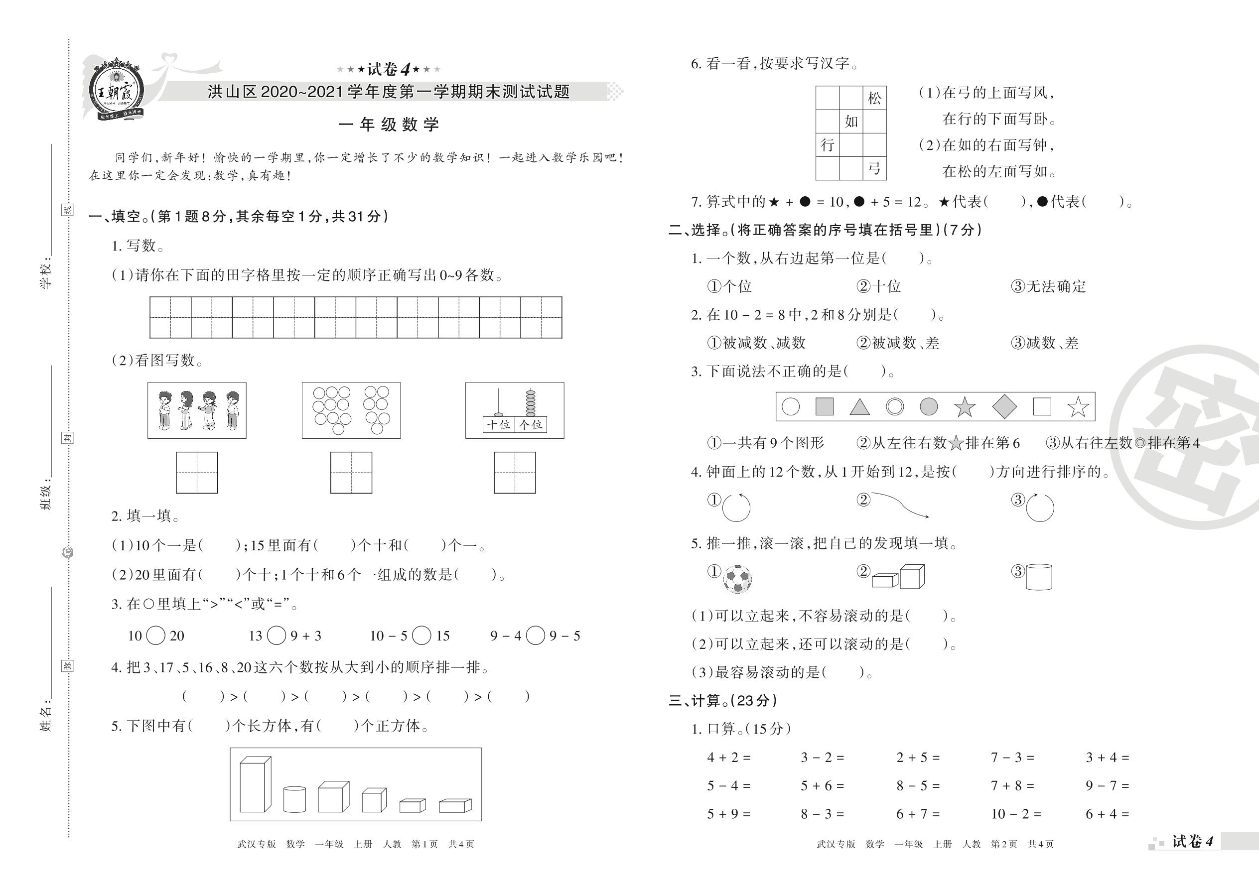 洪山区2020~2021学年度第一学期期末测试试题一年级数学(人教版)【4】