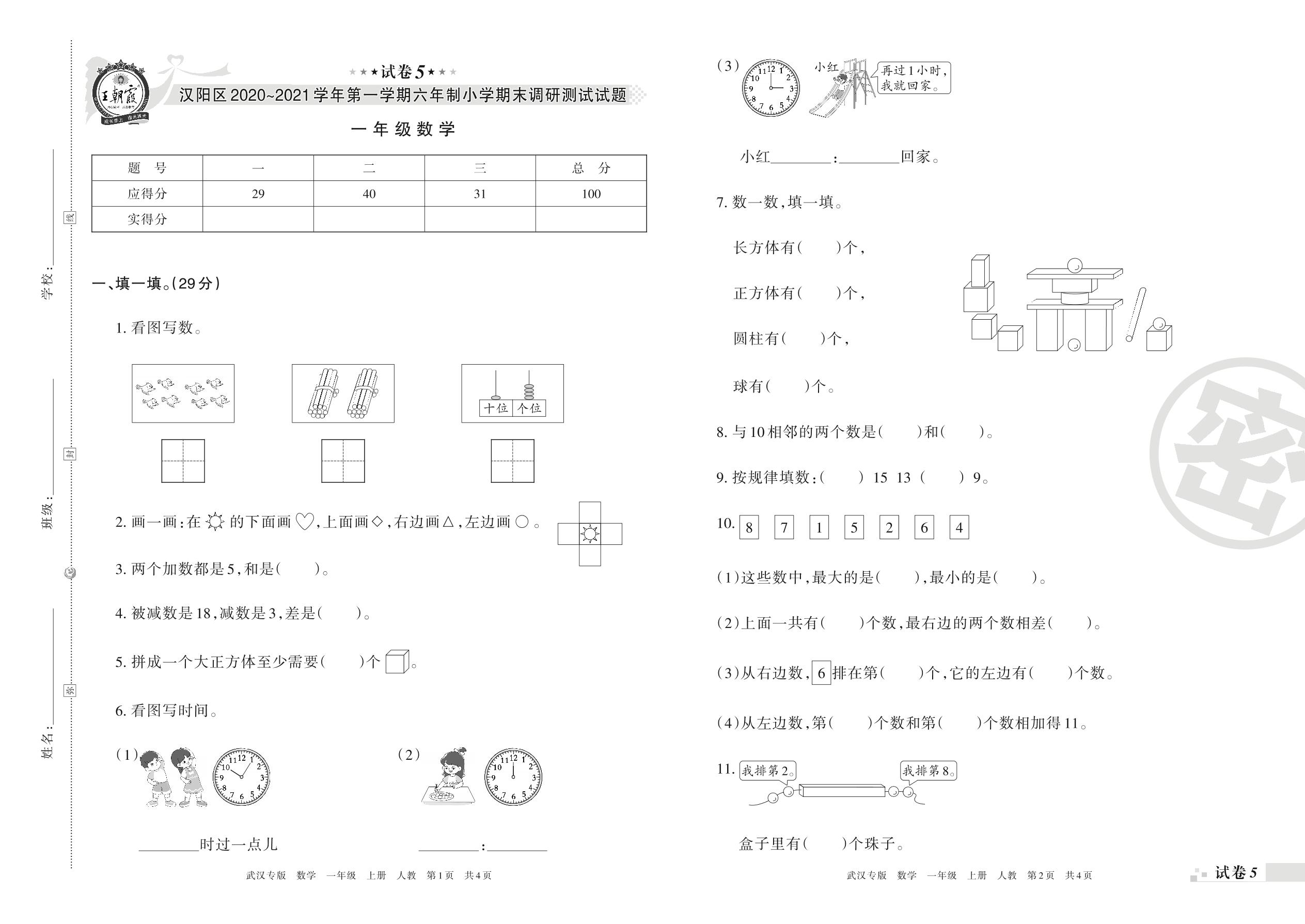 汉阳区2020~2021学年第一学期六年制小学期末调研测试试题一年级数学(人教版)【5】