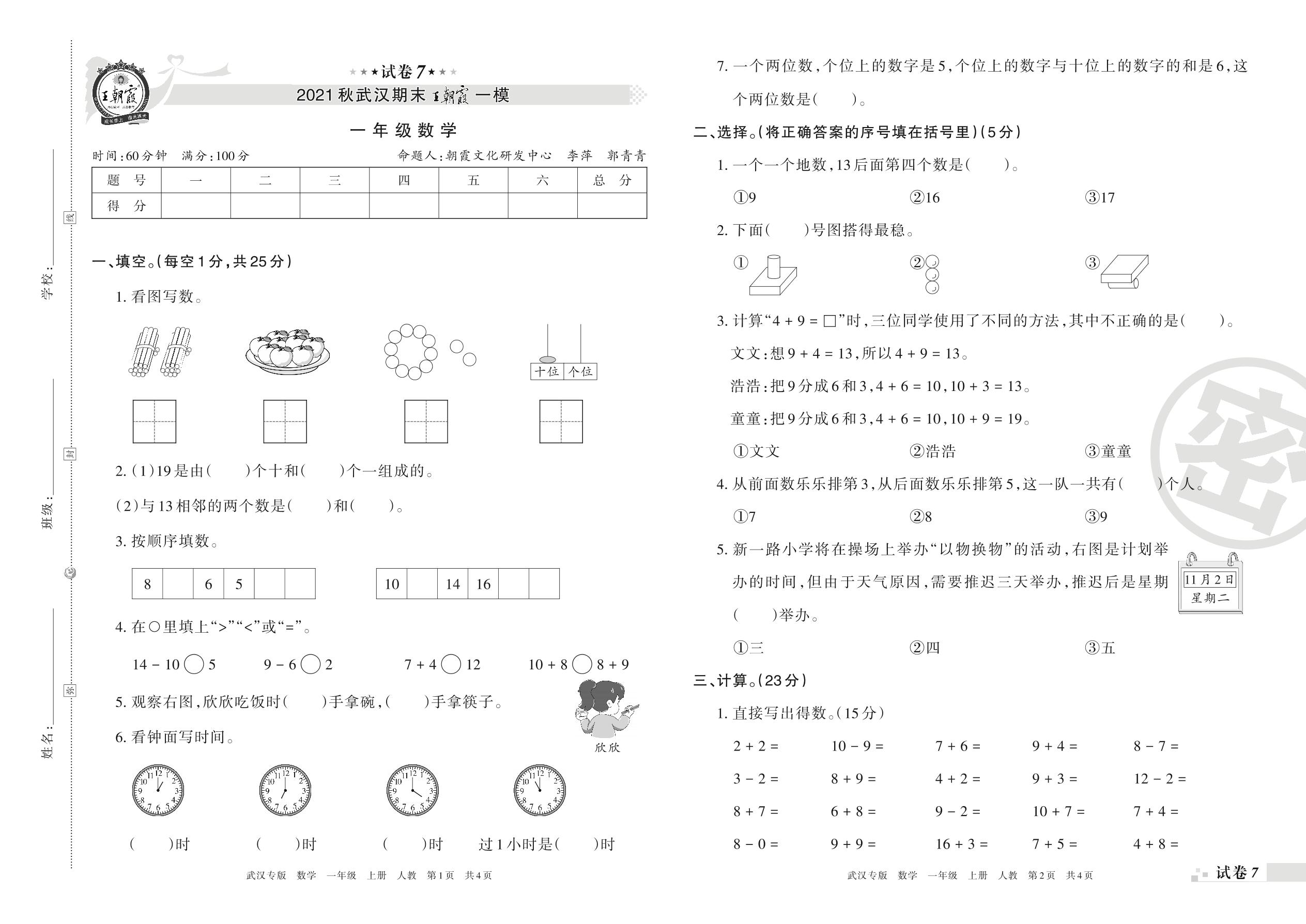 王朝霞期末模拟卷一年级上册数学(人教版)_R211224093749457【7】