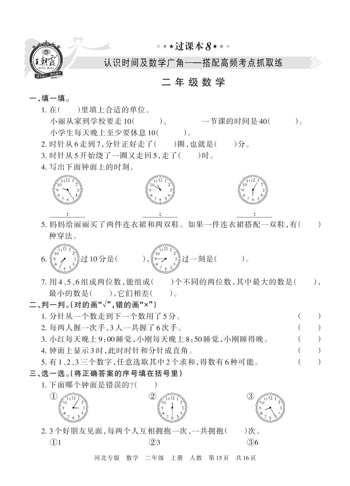 王朝霞期末过课本——认识时间及数学广角:搭配高频考点抓取练二年级上册数学(人教版)_R211224094046405【8】