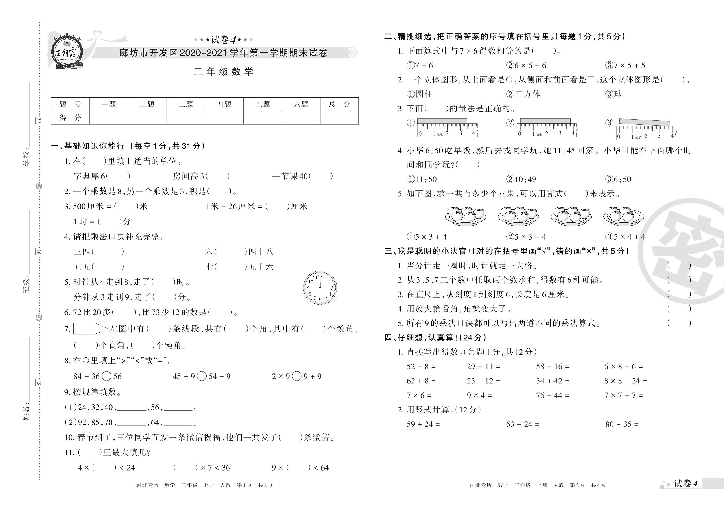 廊坊市开发区2020~2021学年第一学期期末试卷二年级数学(人教版)【4】
