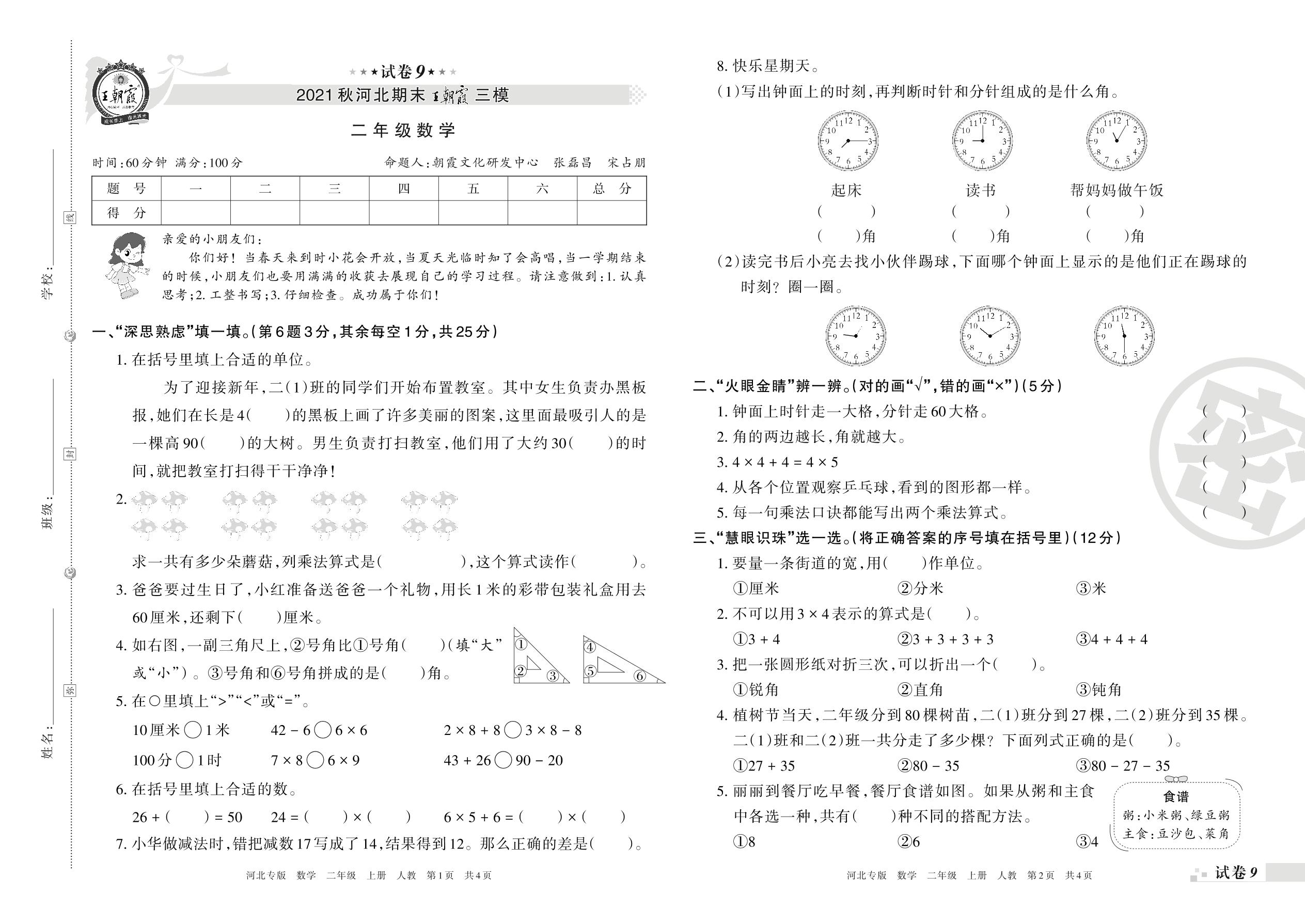 王朝霞期末模拟卷二年级上册数学(人教版)_R211224094047015【9】