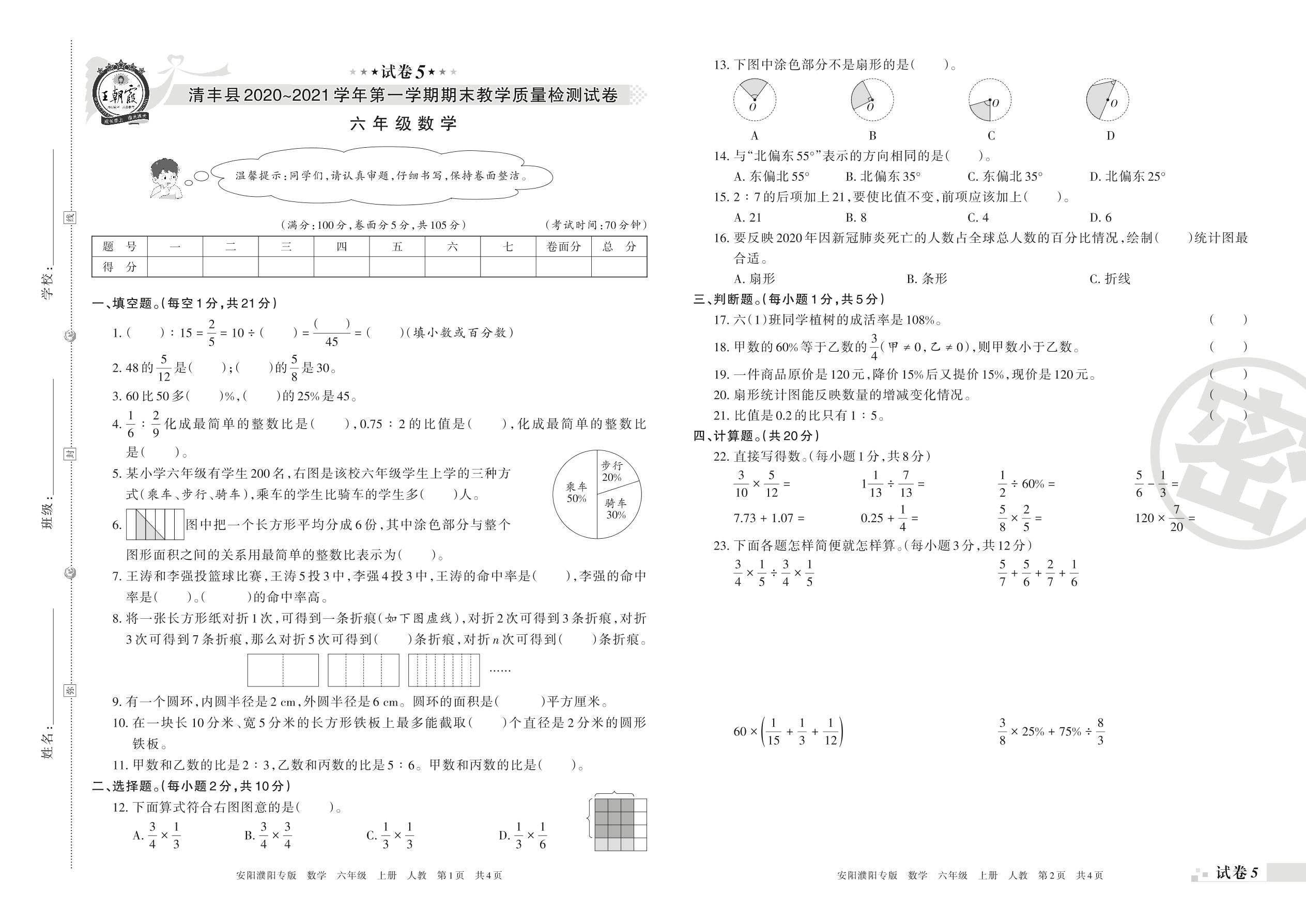 清丰县2020~2021学年第一学期期末教学质量检测试卷六年级数学(人教版)【5】