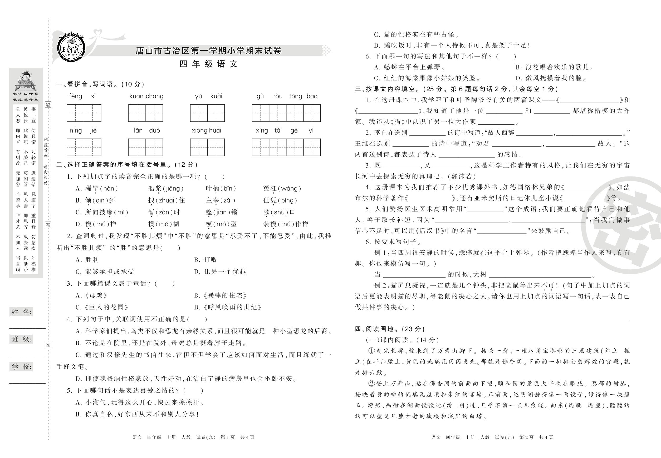 2016-2017学年第一学期唐山市古冶区四年级语文试卷(人教版)【9】