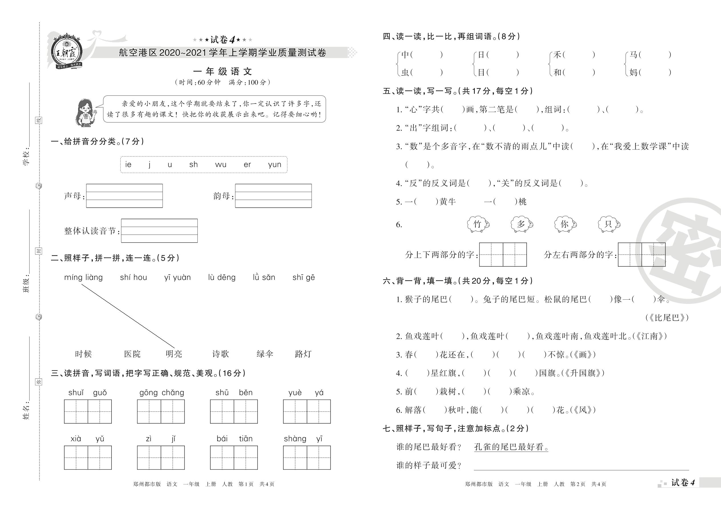 航空港区2020~2021学年上学期学业质量测试卷一年级语文(人教版)【4】