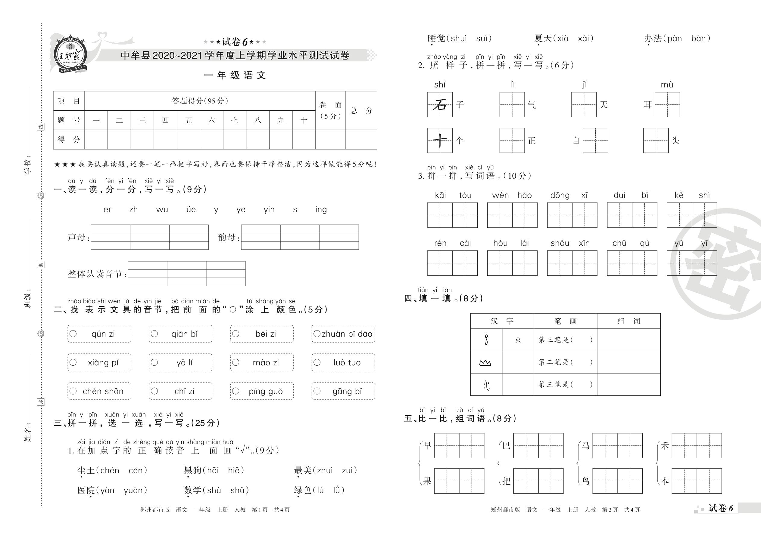 中牟县2020~2021学年度上学期学业水平测试试卷一年级语文(人教版)【6】