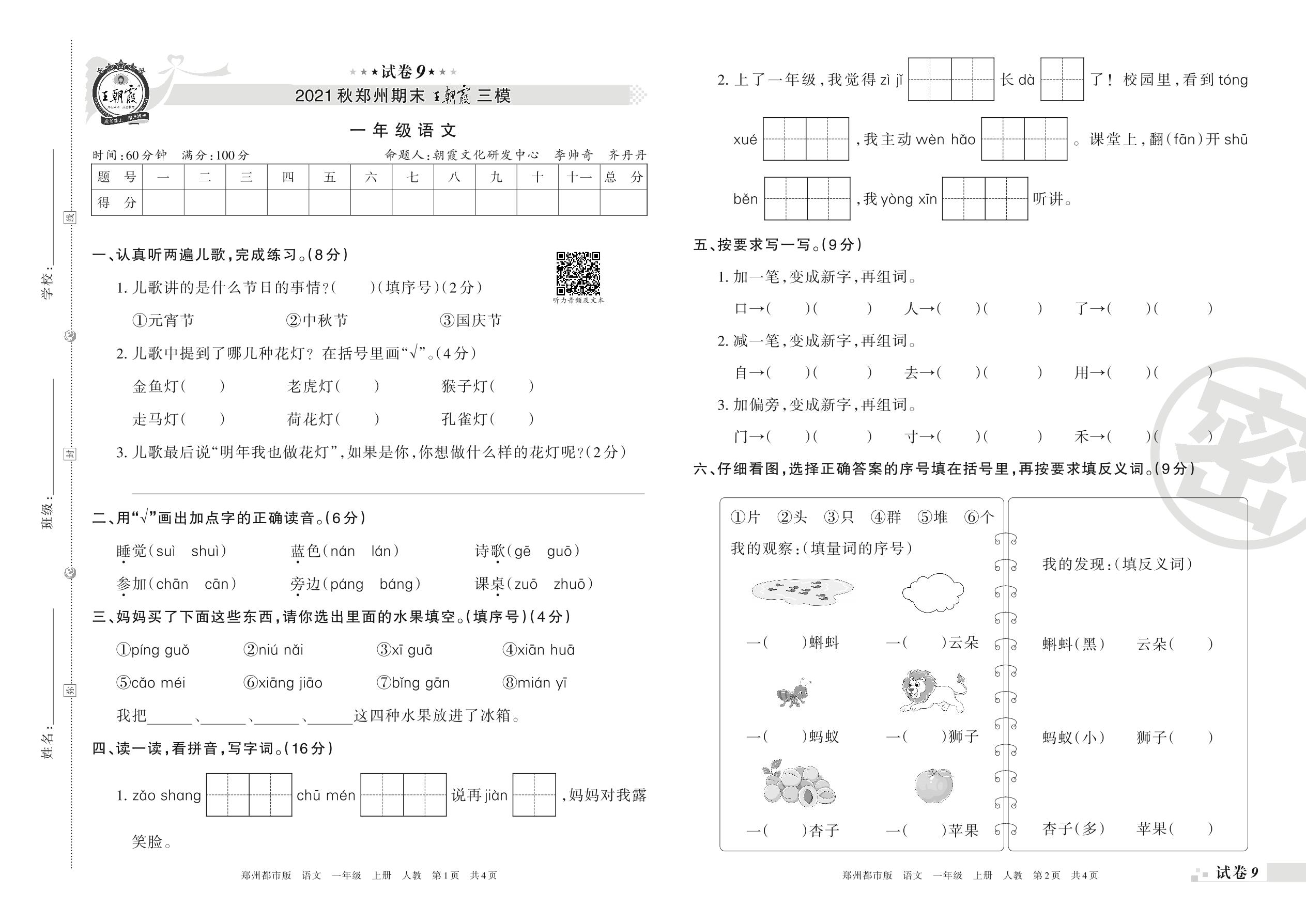 王朝霞期末模拟卷一年级上册语文(人教版)_R211224094133508【9】