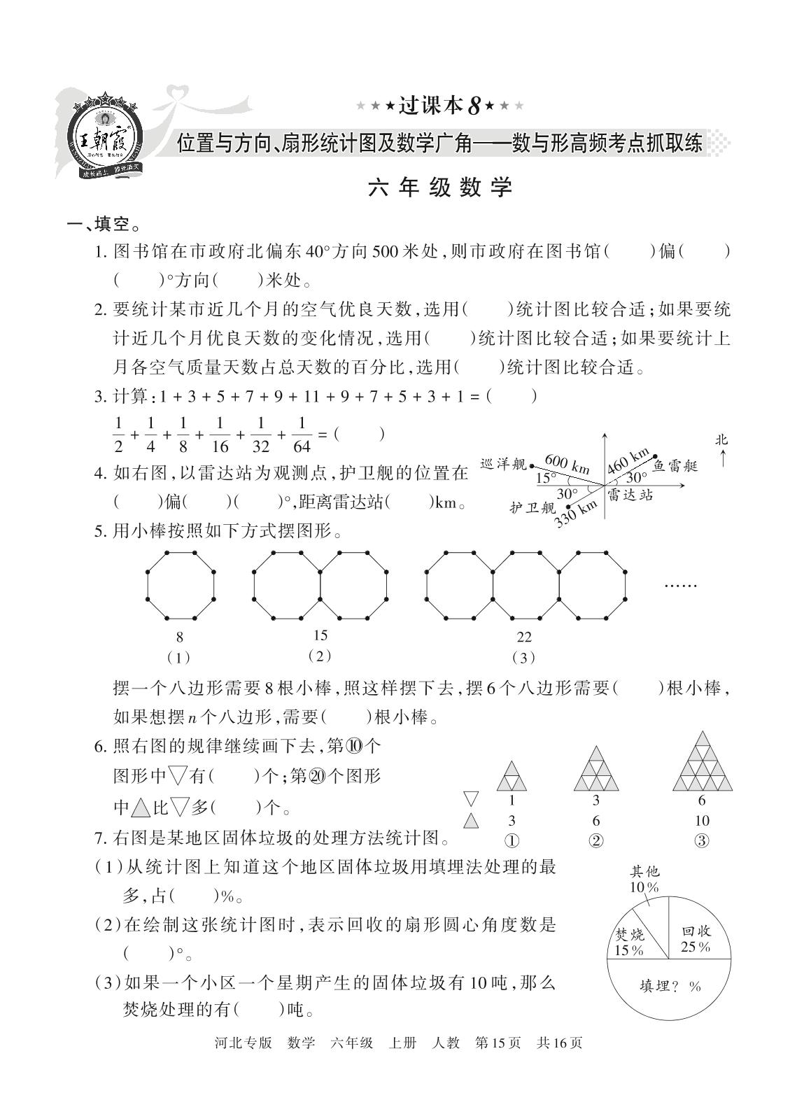 王朝霞期末过课本——位置与方向、扇形统计图及数学广角:数与形高频考点抓取练六年级上册数学(人教版)_R211224094904473【8】
