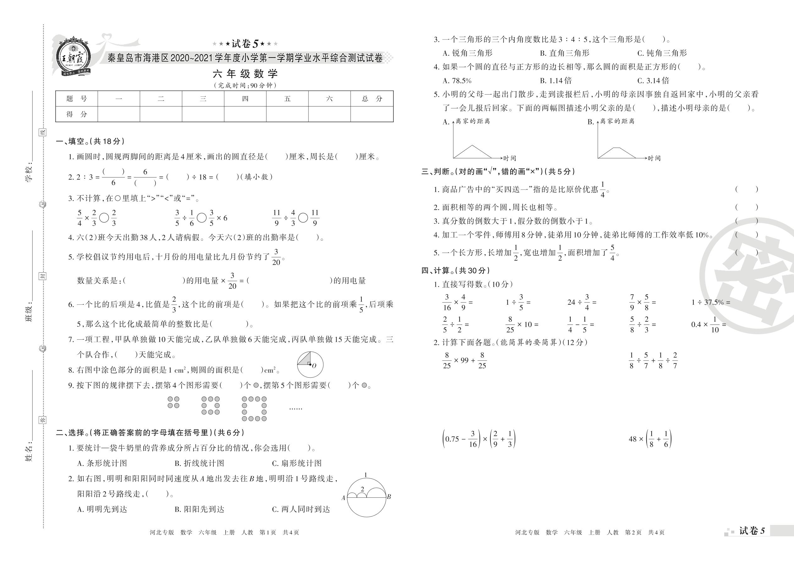 秦皇岛市海港区2020~2021学年度小学第一学期学业水平综合测试试卷六年级数学(人教版)【5】