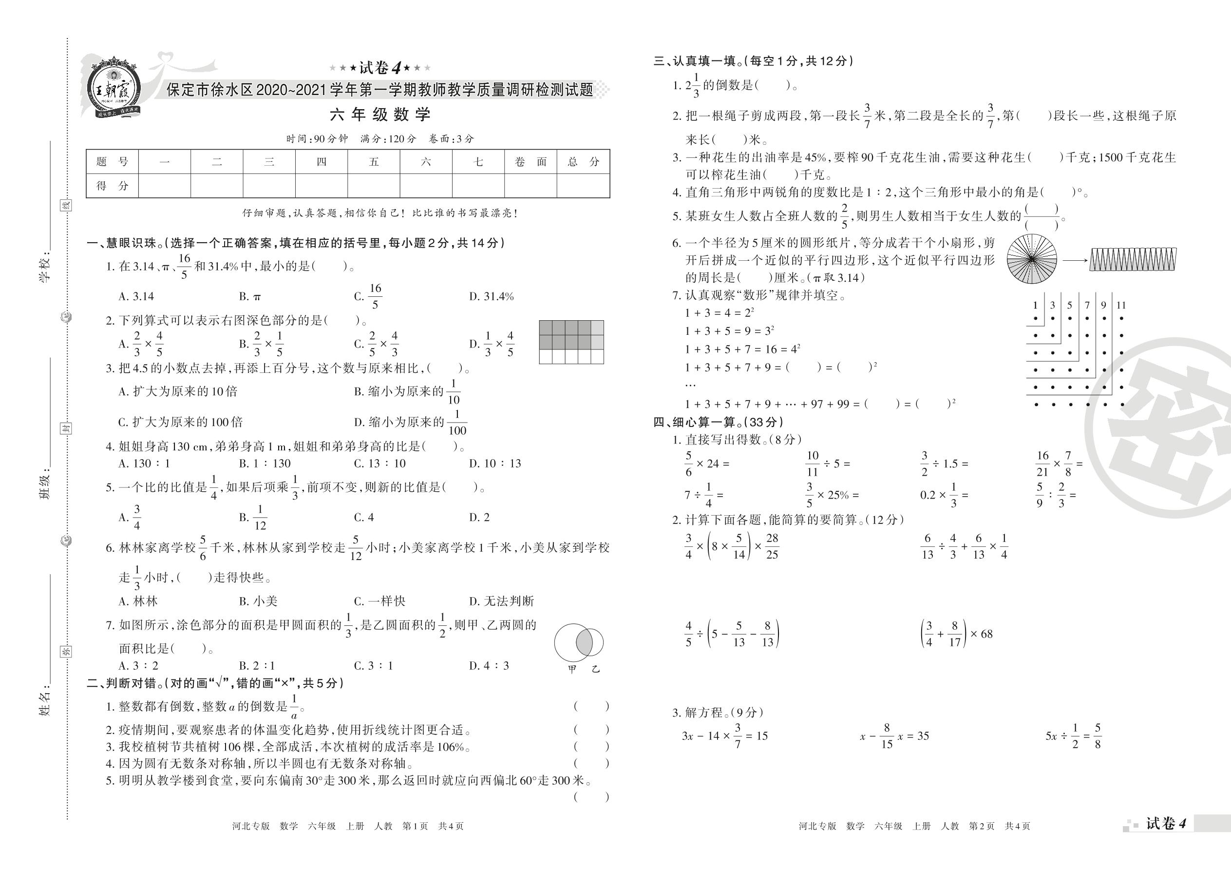 保定市徐水区2020~2021学年第一学期教师教学质量调研检测试题六年级数学(人教版)【4】