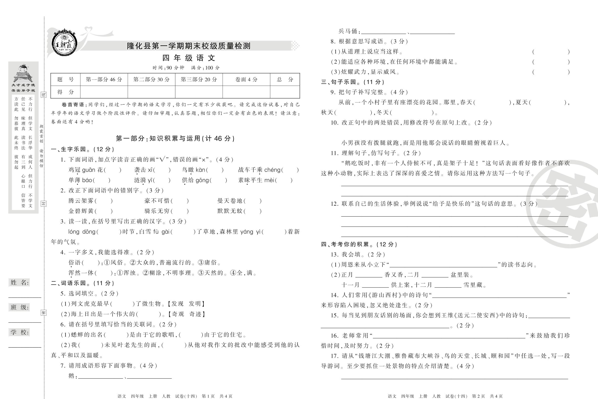 2016-2017学年第一学期承德市隆化县四年级语文试卷(人教版)【14】