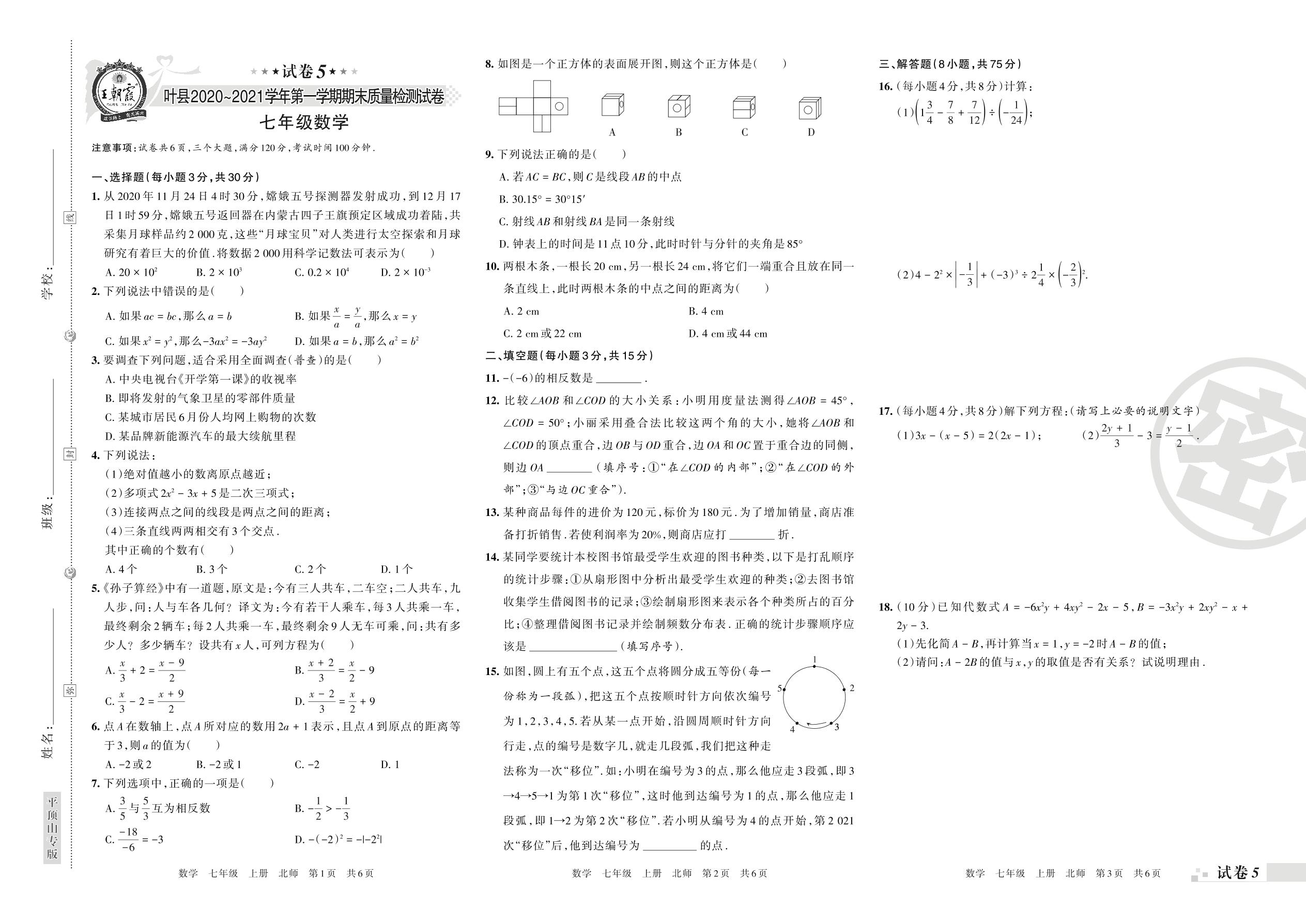 叶县2020~2021学年第一学期期末质量检测试卷七年级数学(北师版)【5】