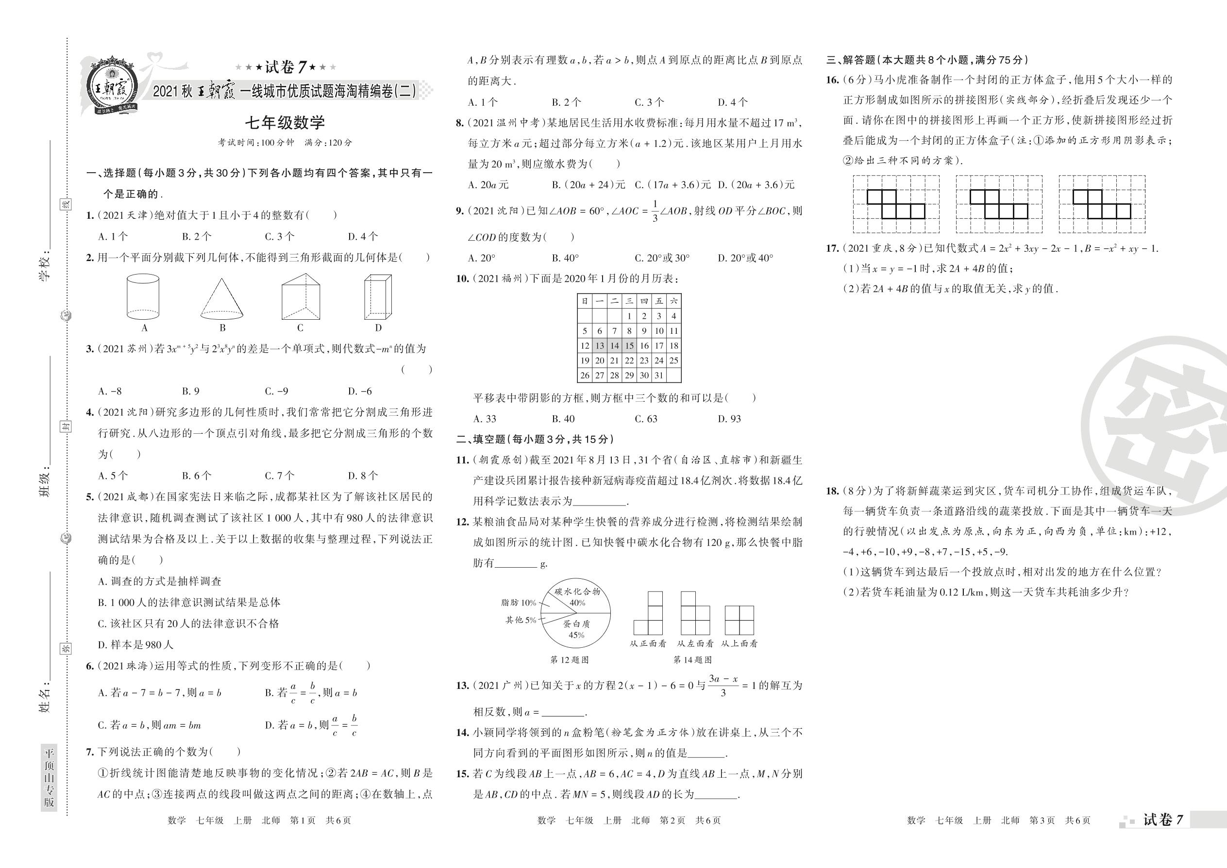 2021秋王朝霞一线城市优质试题海淘精编卷(二)七年级数学(北师版)【7】