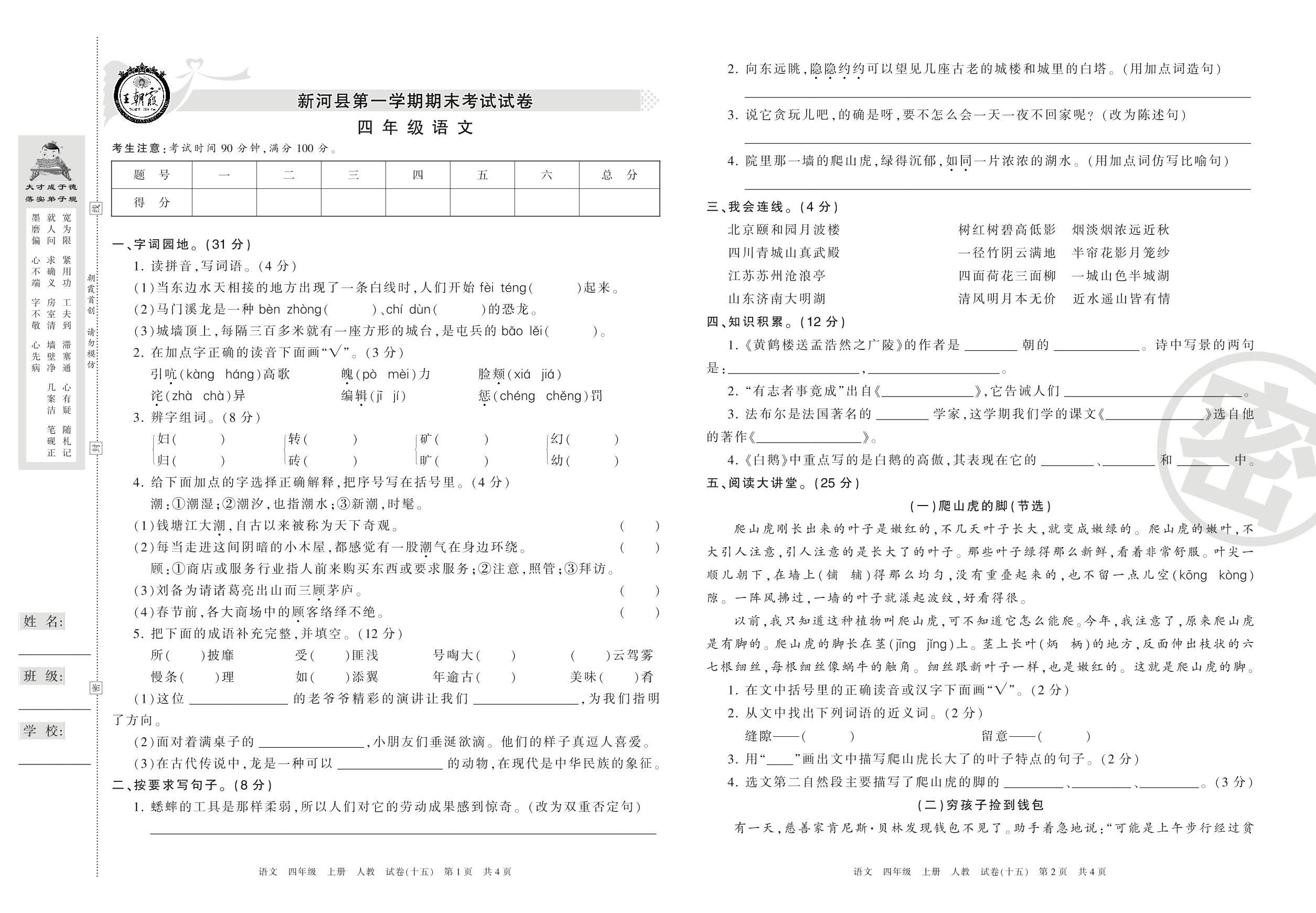 2016-2017学年第一学期邢台市新河县四年级语文试卷(人教版)【15】