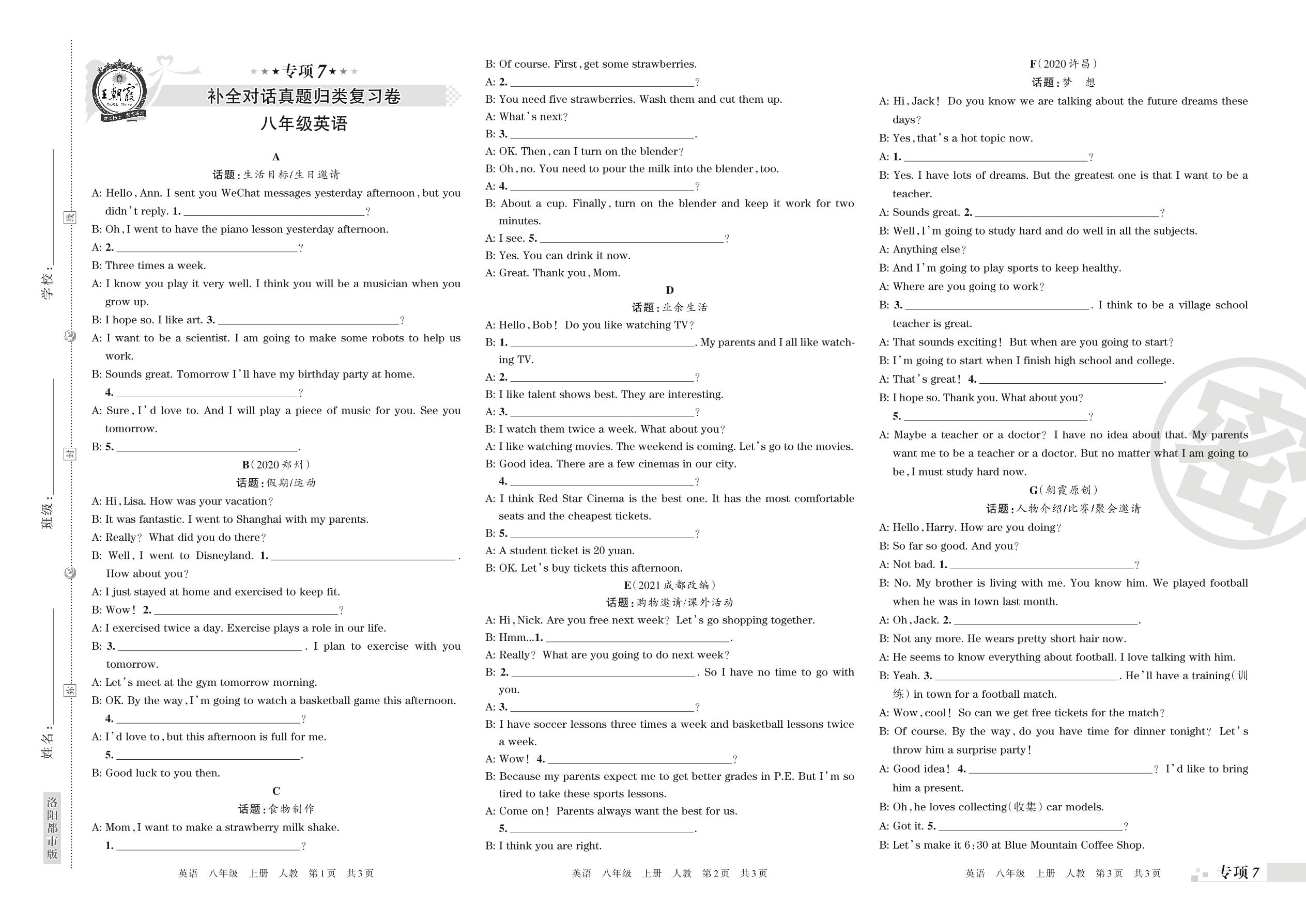王朝霞期末专项卷——补全对话真题归类复习卷八年级上册英语(人教版)_R211224095600254【7】