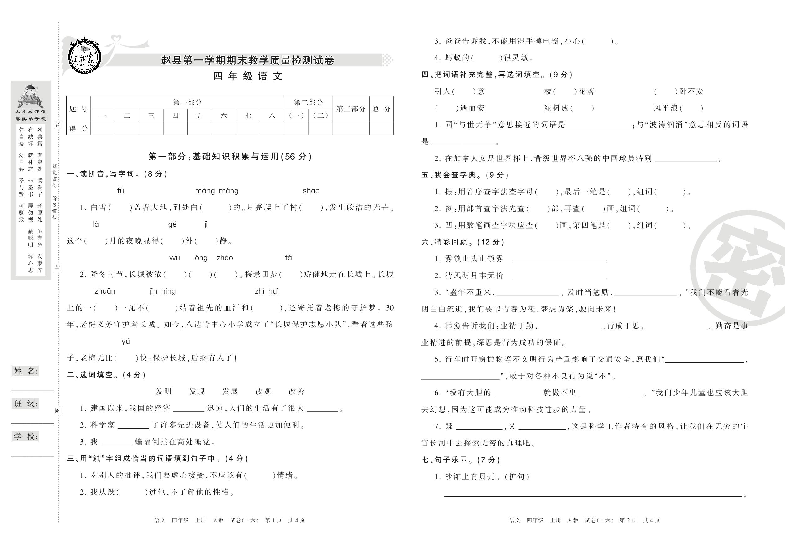 2016-2017学年第一学期石家庄市赵县四年级语文试卷(人教版)【16】