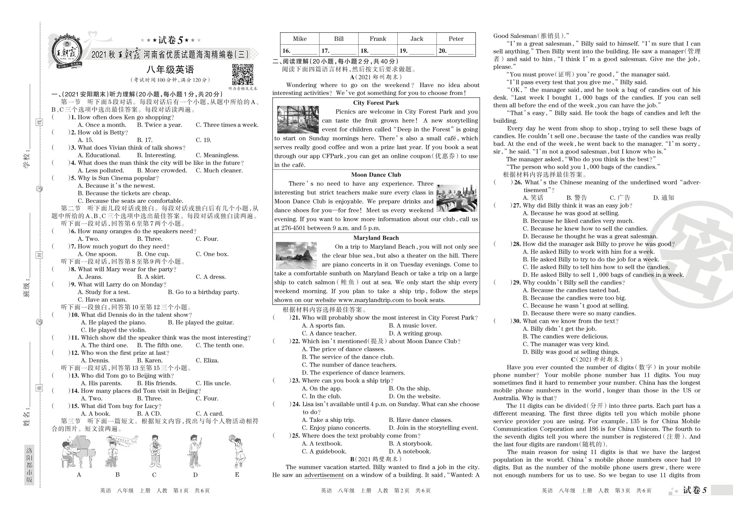 2021秋王朝霞河南省优质试题海淘精编卷(三)八年级英语(人教版)【5】