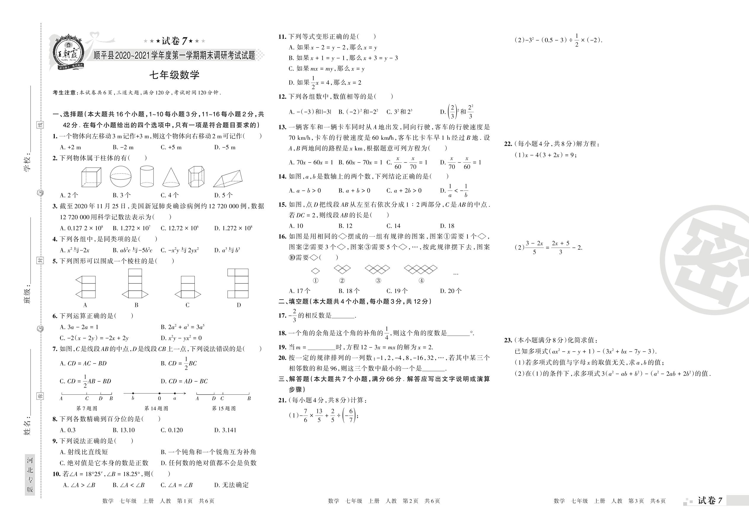 顺平县2020~2021学年度第一学期期末调研考试试题七年级数学(人教版)【7】