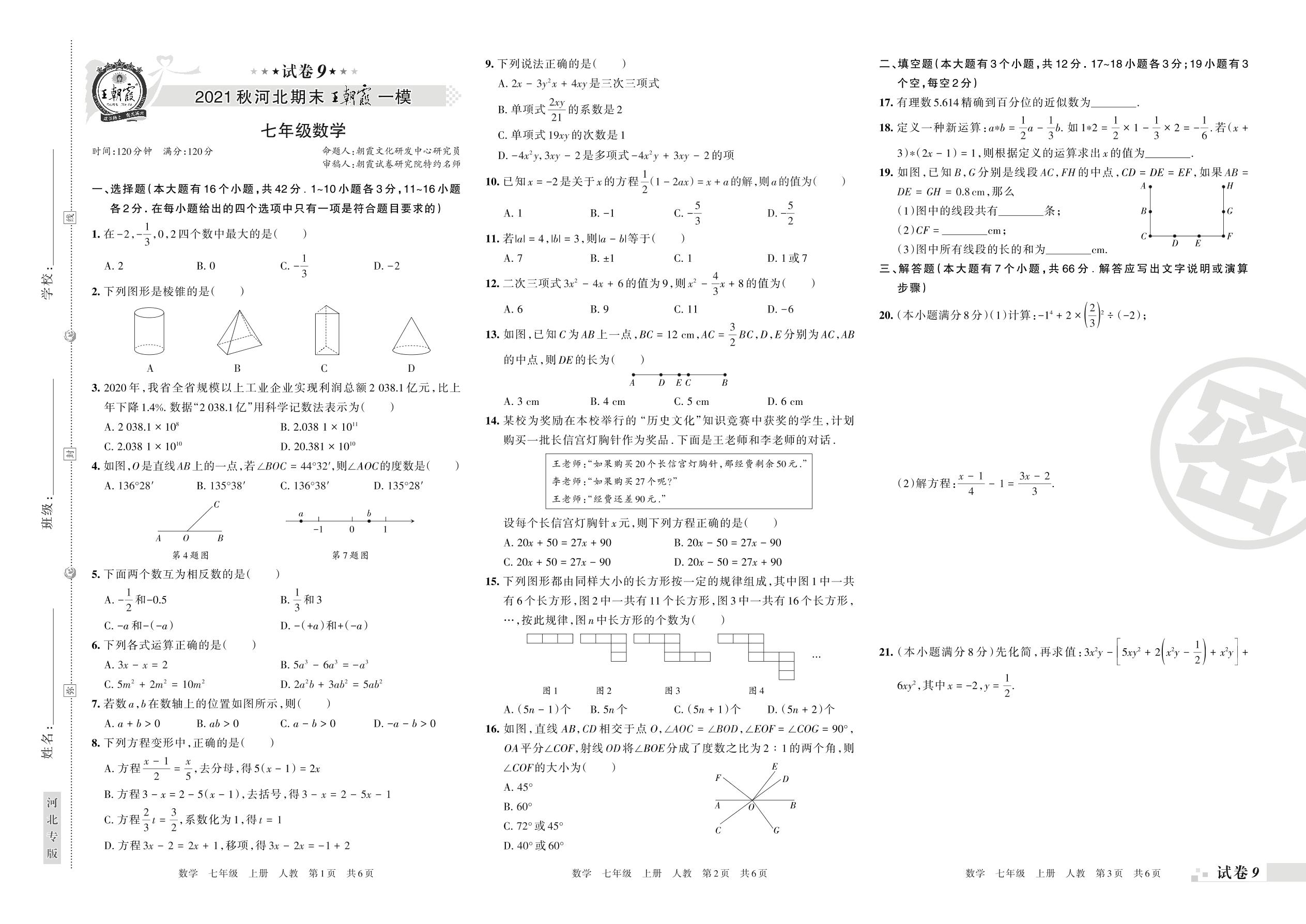 王朝霞期末模拟卷七年级上册数学(人教版)【9】