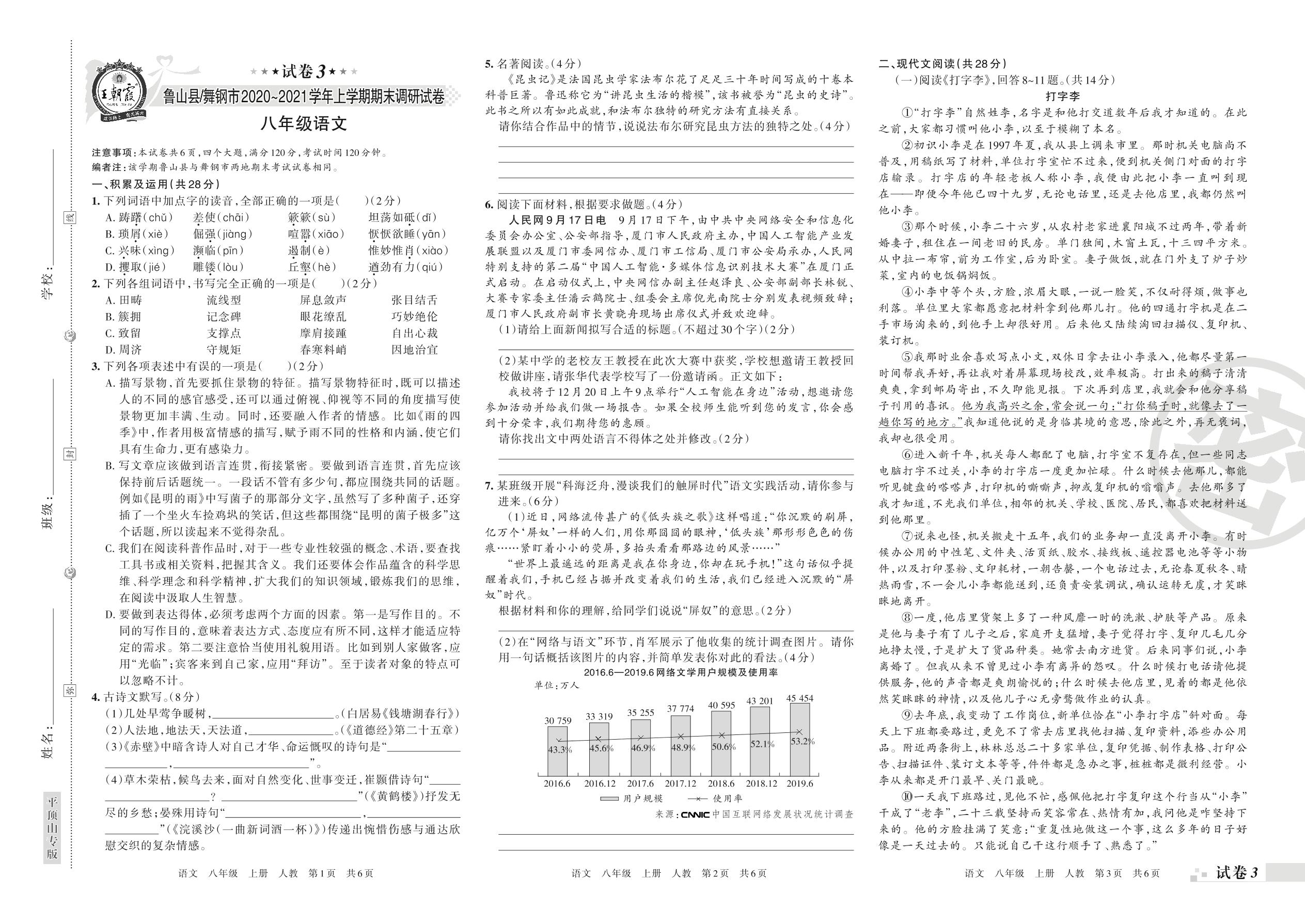 鲁山县、舞钢市2020~2021学年上学期期末调研试卷八年级语文(人教版)【3】