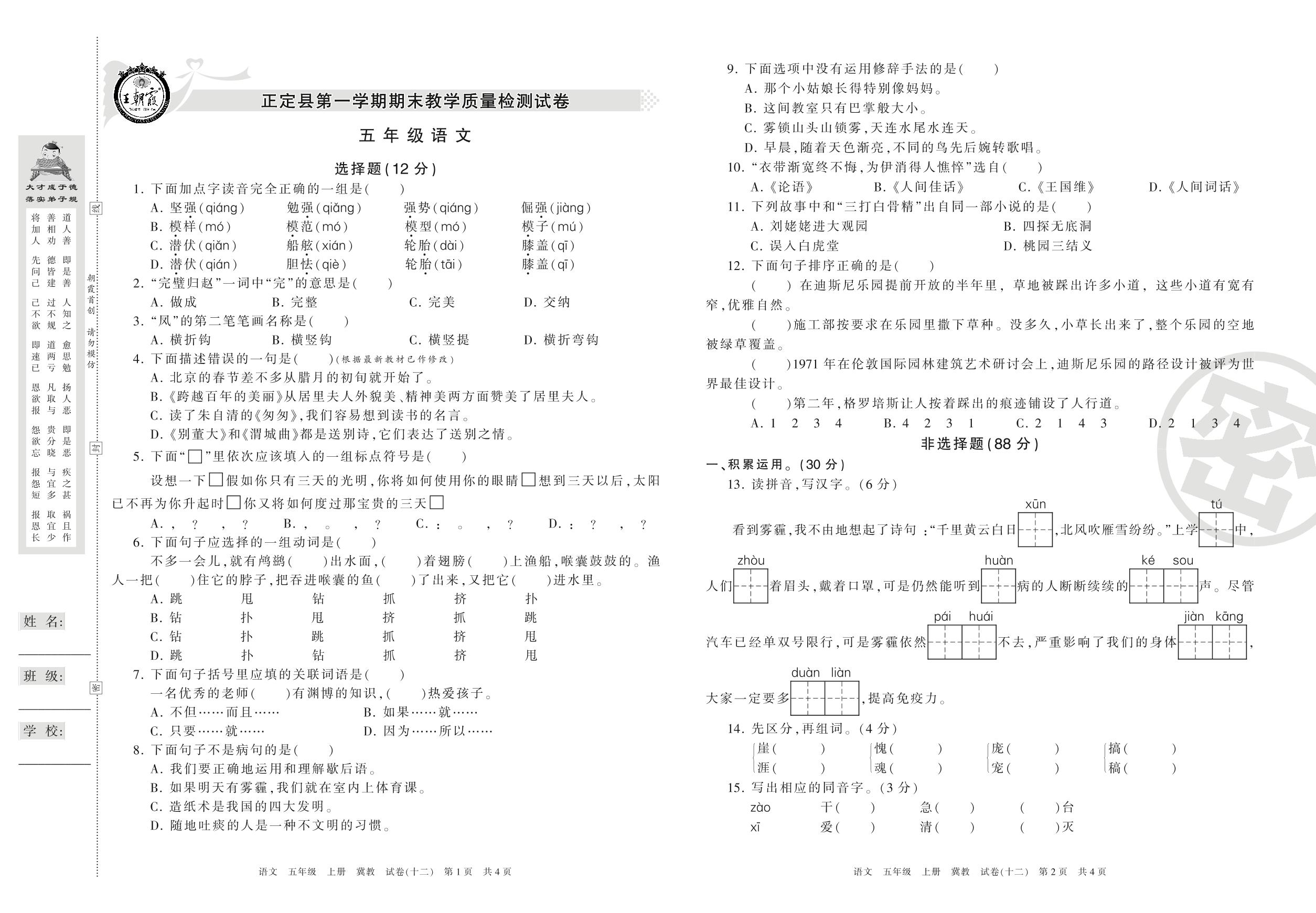2016-2017学年第一学期石家庄市正定县五年级语文试卷(冀教版)【12】