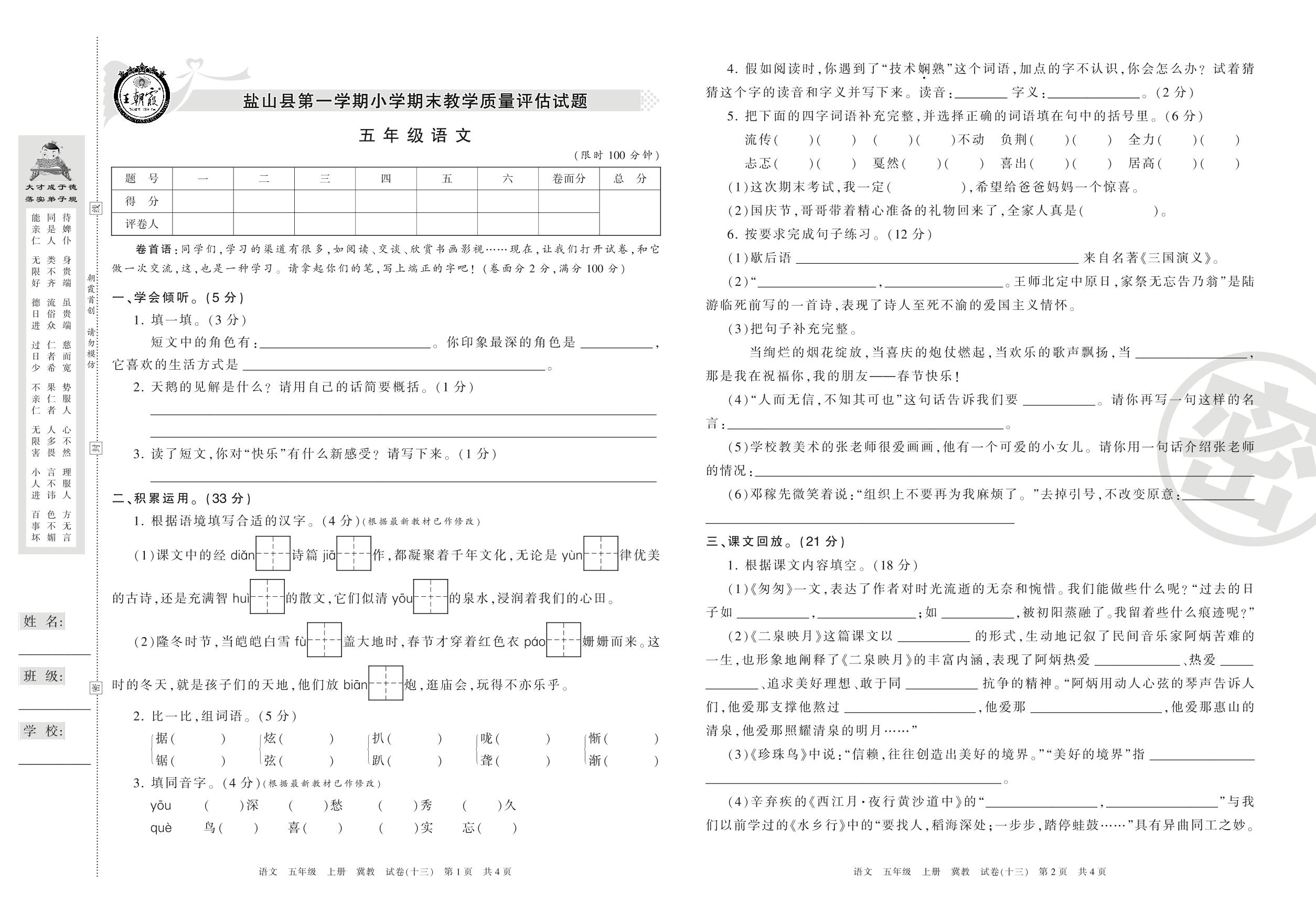 2016-2017学年第一学期沧州市盐山县五年级语文试卷(冀教版)【13】