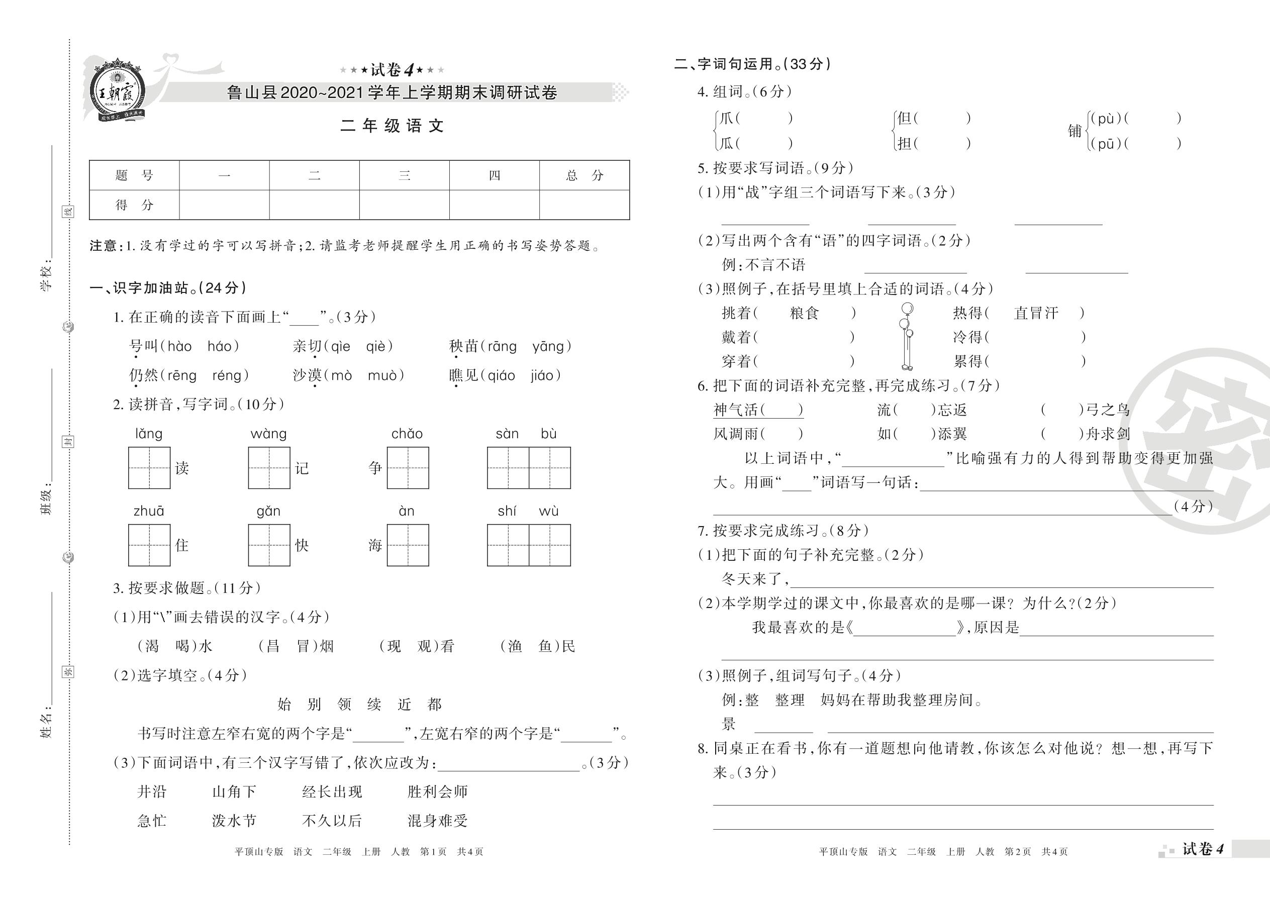 鲁山县2020~2021学年上学期期末调研试卷二年级语文(人教版)【4】