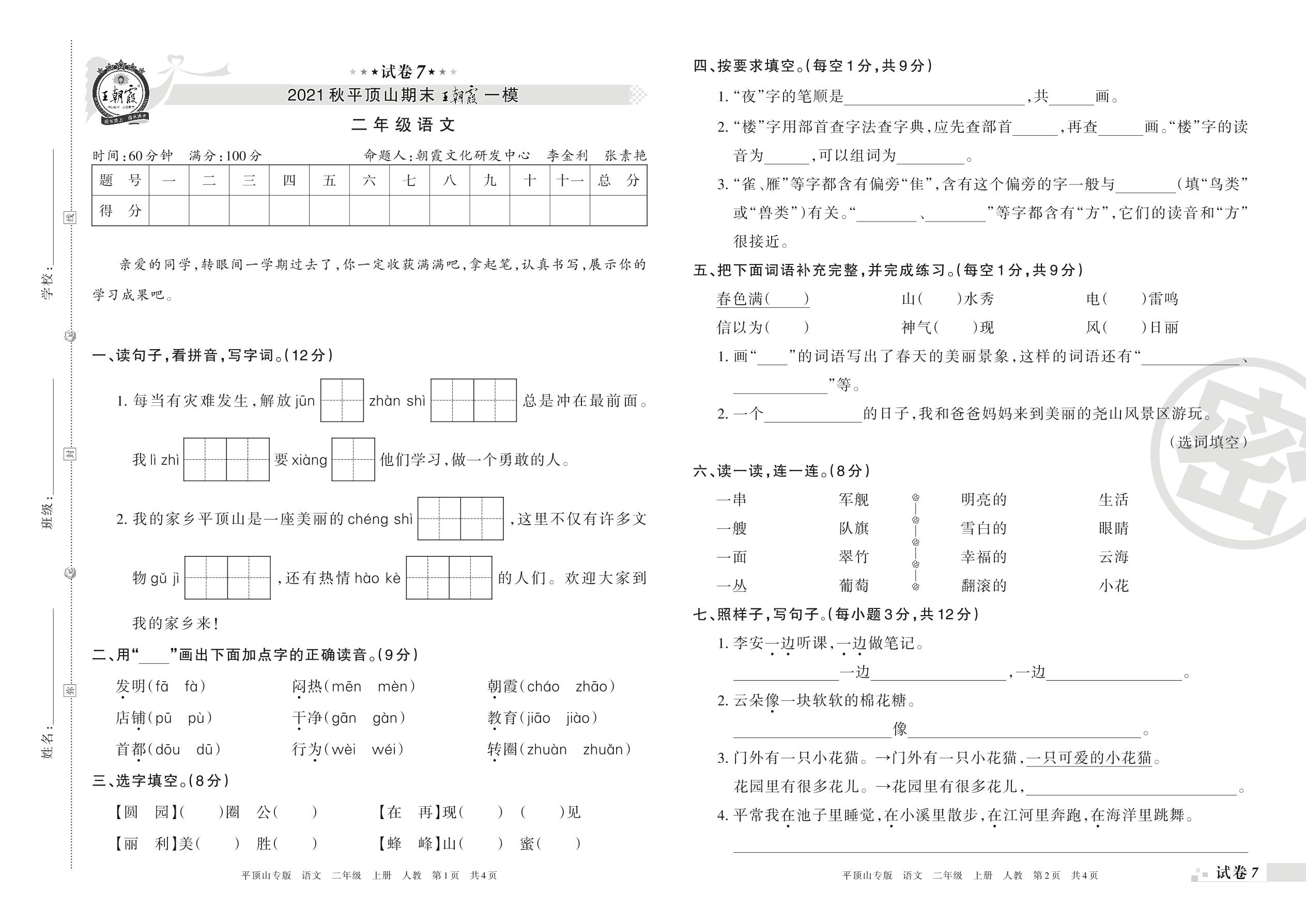 王朝霞期末模拟卷二年级上册语文(人教版)_R211224100723114【7】