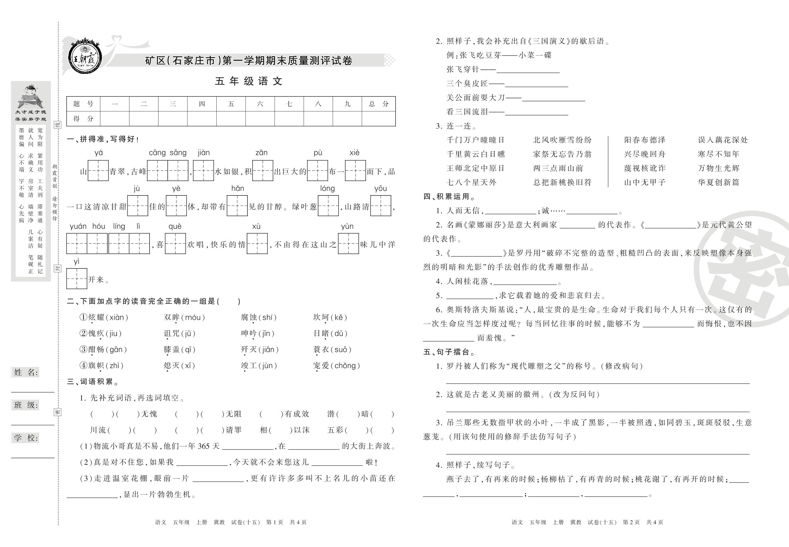 2016-2017学年第一学期矿区(石家庄市)五年级语文试卷(冀教版)【15】