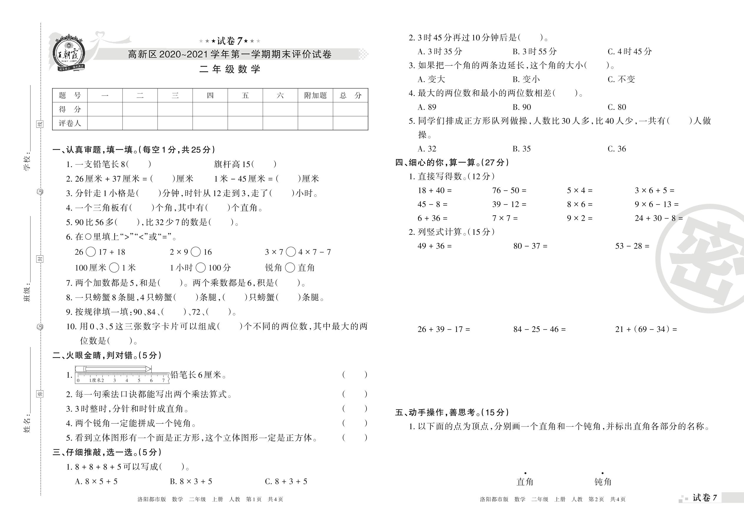 高新区2020~2021学年第一学期期末评价试卷二年级数学(人教版)【7】
