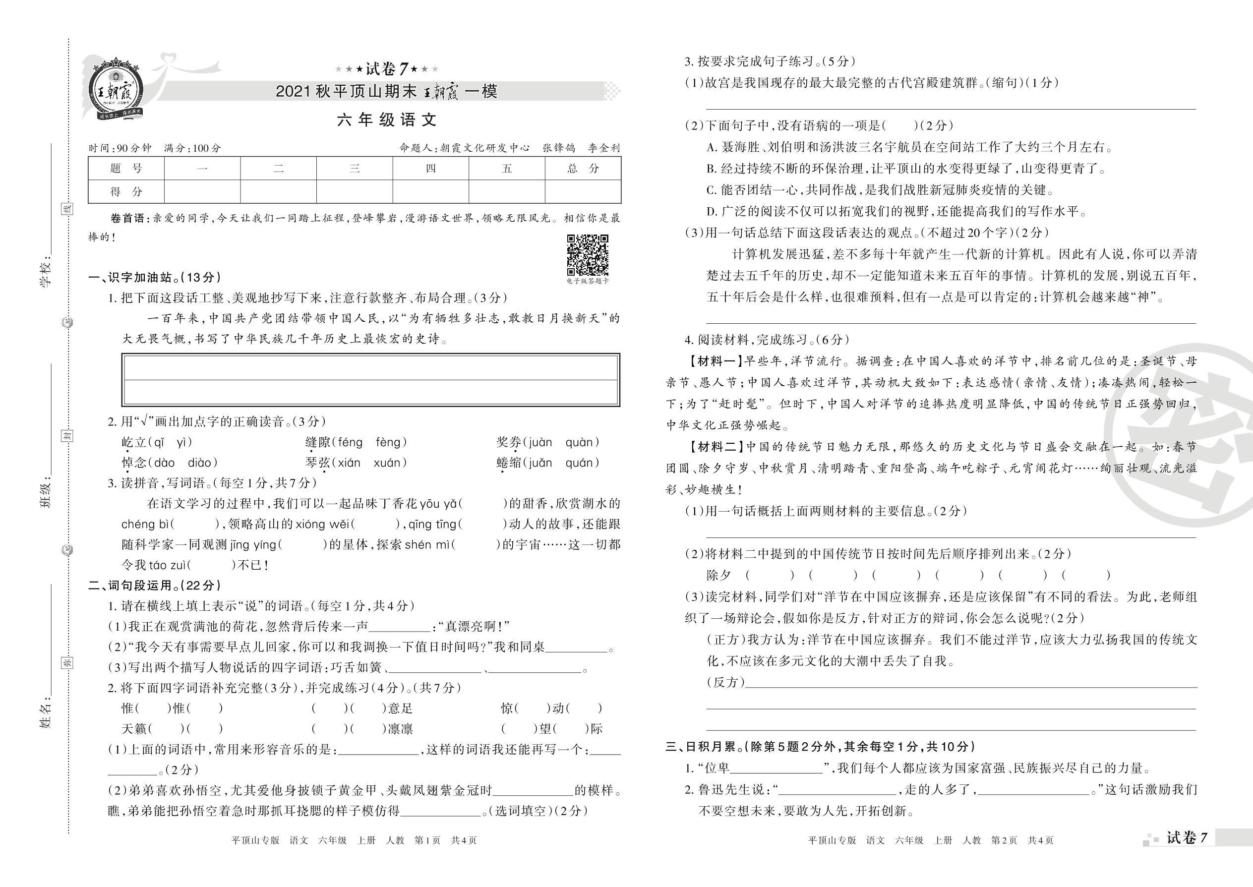 王朝霞期末模拟卷六年级上册语文(人教版)_R211224101132948【7】