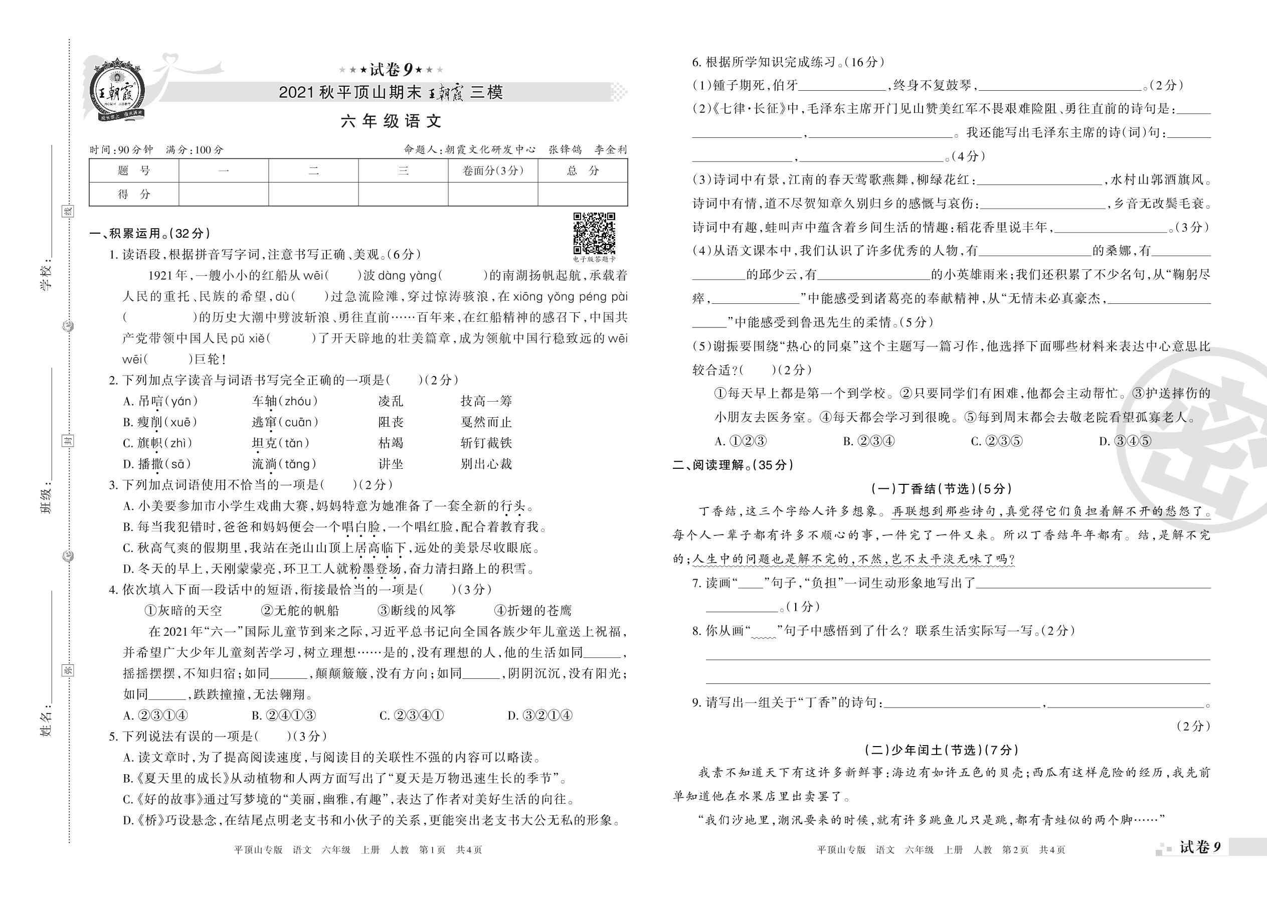 王朝霞期末模拟卷六年级上册语文(人教版)_R211224101132075【9】