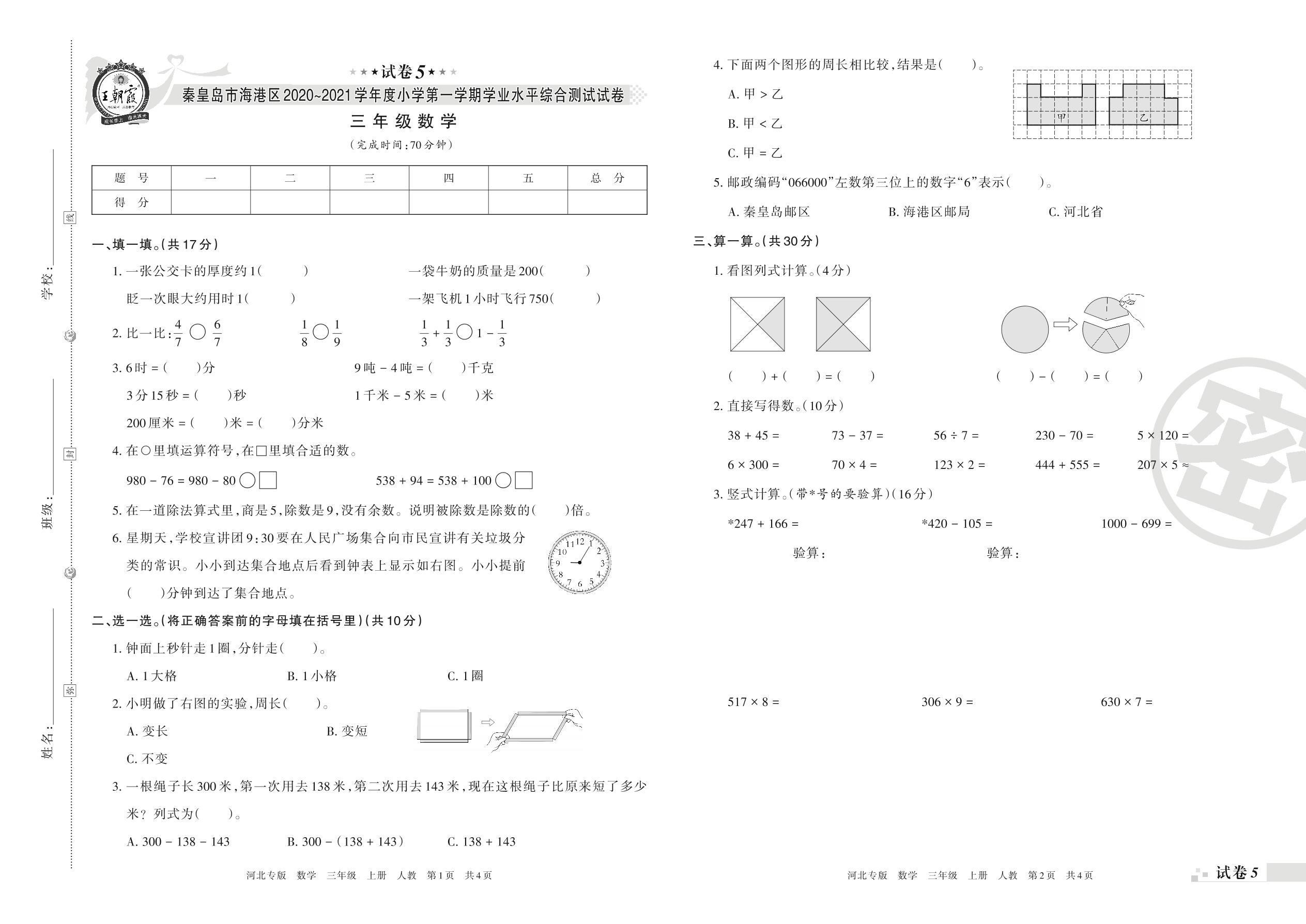 秦皇岛市海港区2020~2021学年度小学第一学期学业水平综合测试试卷三年级数学(人教版)【5】