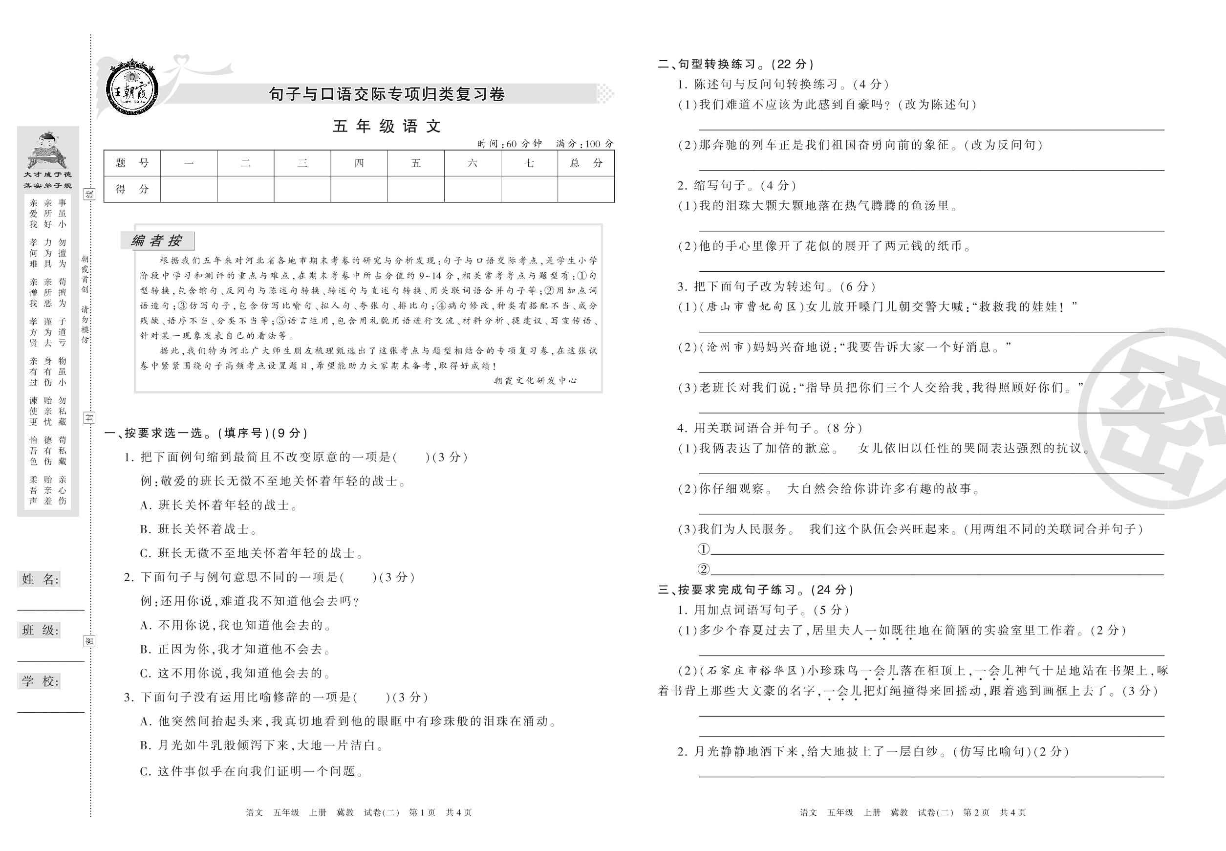 王朝霞期末专项卷五年级上册语文(冀教版)【2】