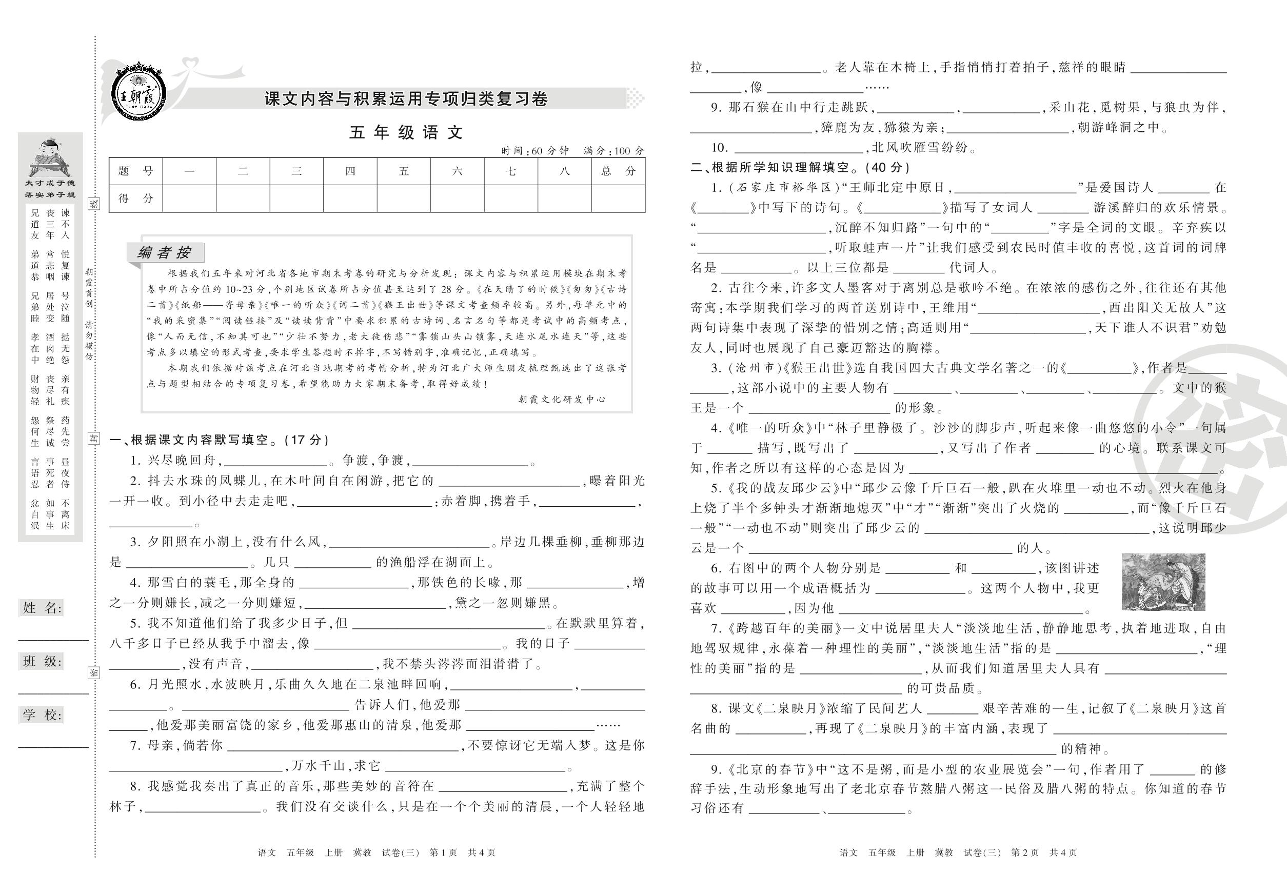 王朝霞期末专项卷五年级上册语文(冀教版)【3】