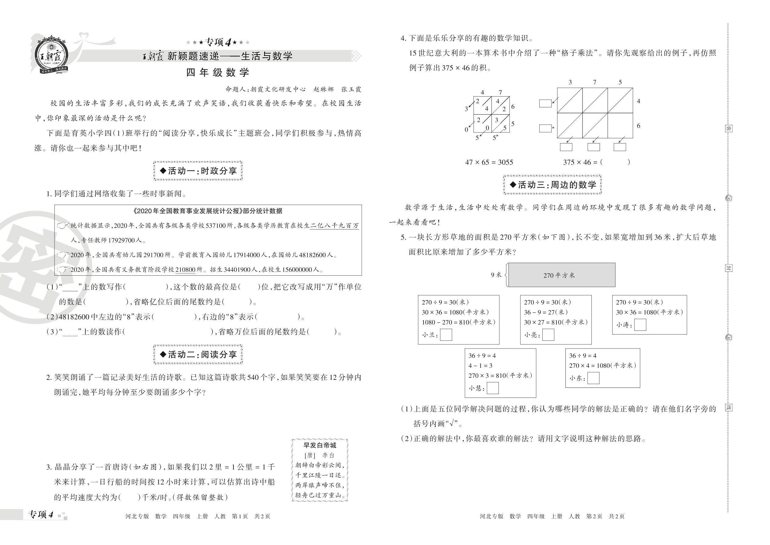王朝霞期末专项卷——新颖题速递:生活与数学四年级上册数学(人教版)_R211224101722030【4】
