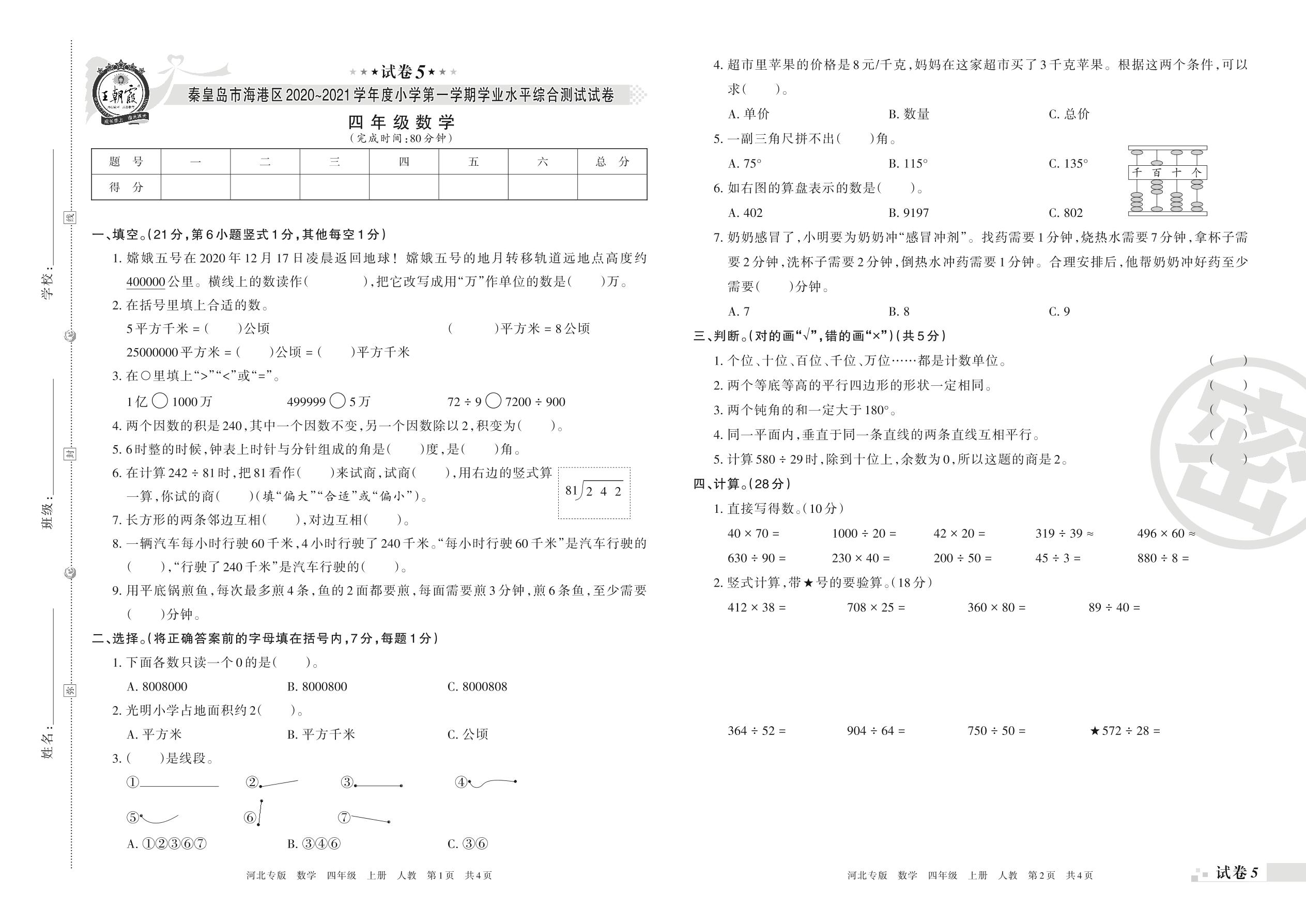 秦皇岛市海港区2020~2021学年度小学第一学期学业水平综合测试试卷四年级数学(人教版)【5】