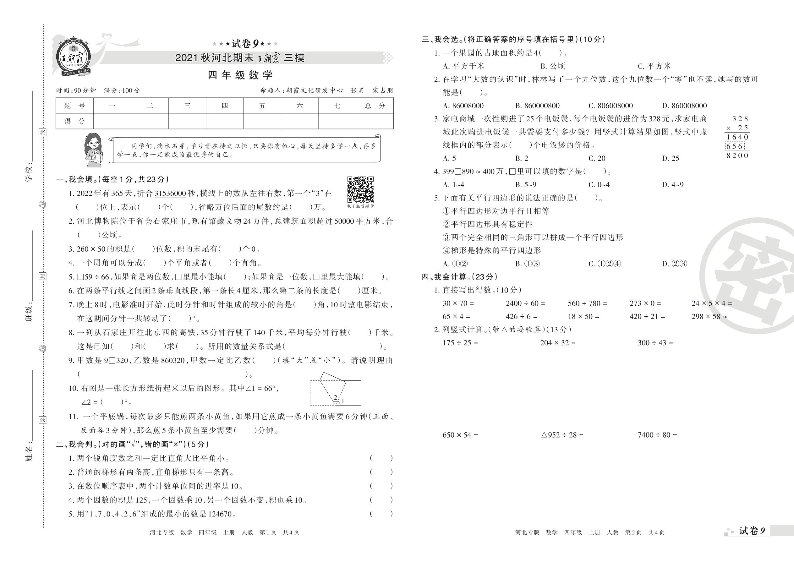 王朝霞期末模拟卷四年级上册数学(人教版)_R211224101722729【9】
